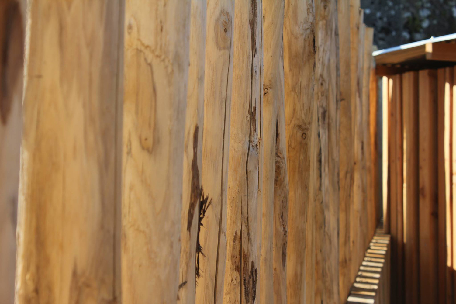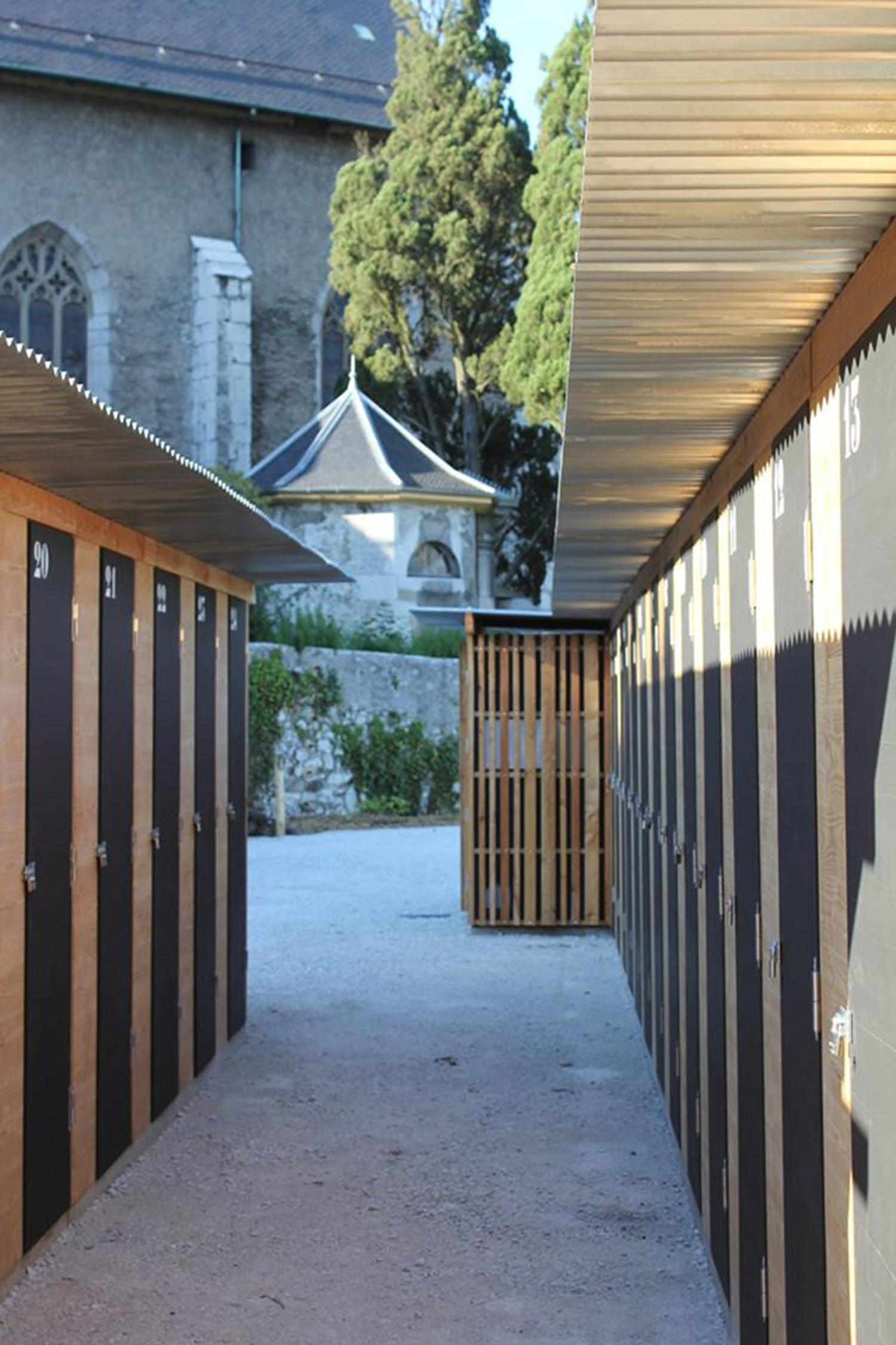 Les parcelles disposent de cabanons de jardins regroupés près de l’entrée, sur trois rangées. Bâtis sur une ossature en bois, ils se parent d’un bardage aléatoire en mélèze et se couvrent d’une simple couverture de tôle ondulée en acier galvanisé. Avec le temps, ces matériaux vont prendre une agréable patine argentée.