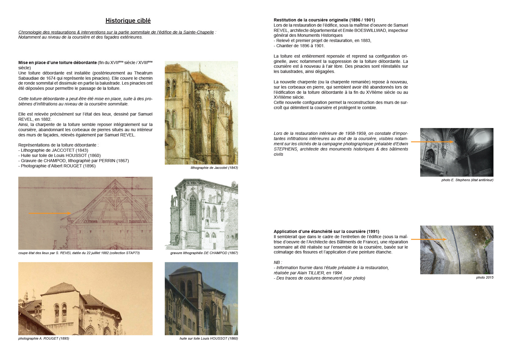 Avant un bref rappel sur l’histoire de la Sainte-Chapelle, et plus particulièrement sur les évolutions et les restaurations successives de la partie sommitale de l’édifice, nous proposons une analyse préliminaire puis la définition de la méthodologie de ce diagnostic.