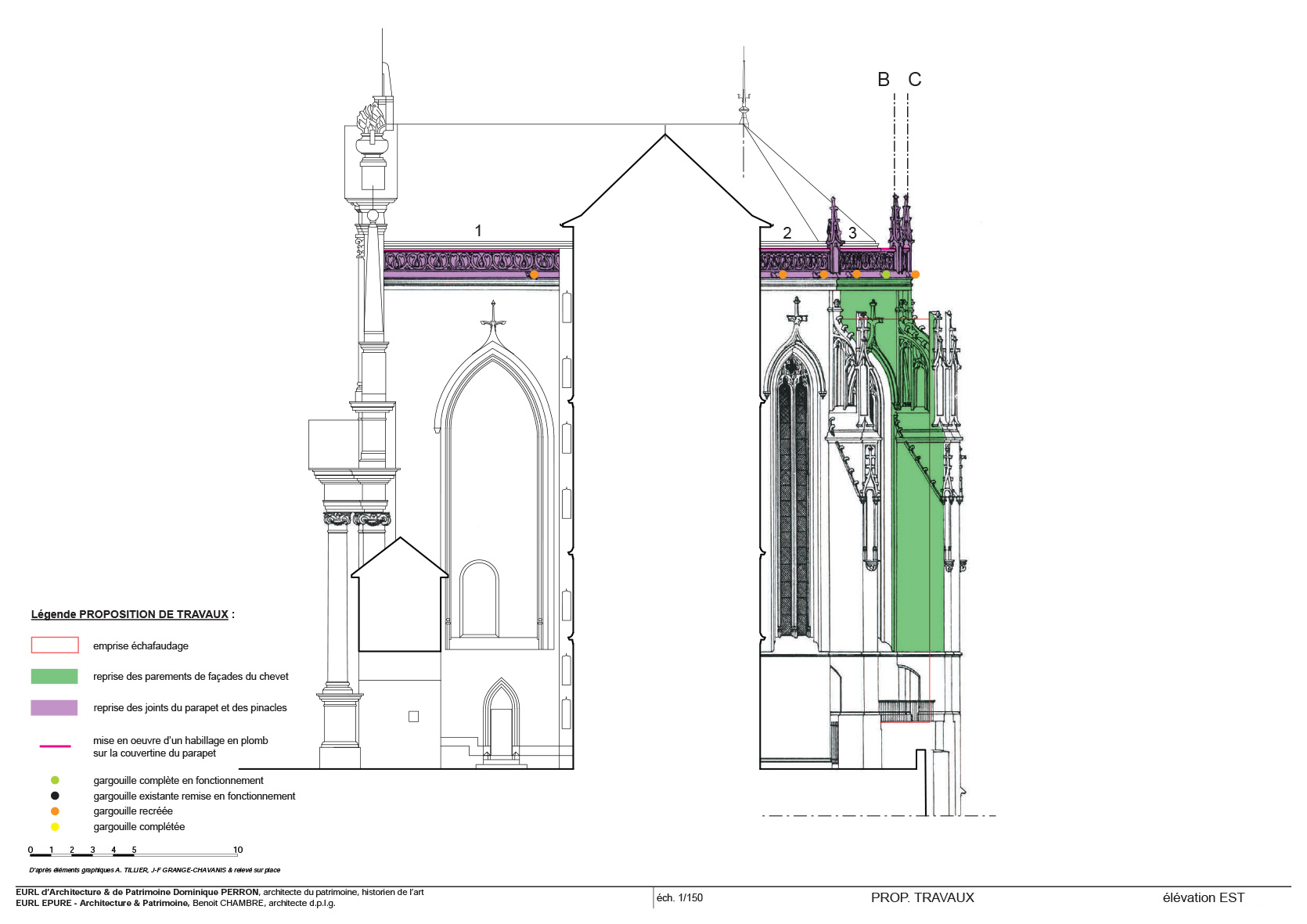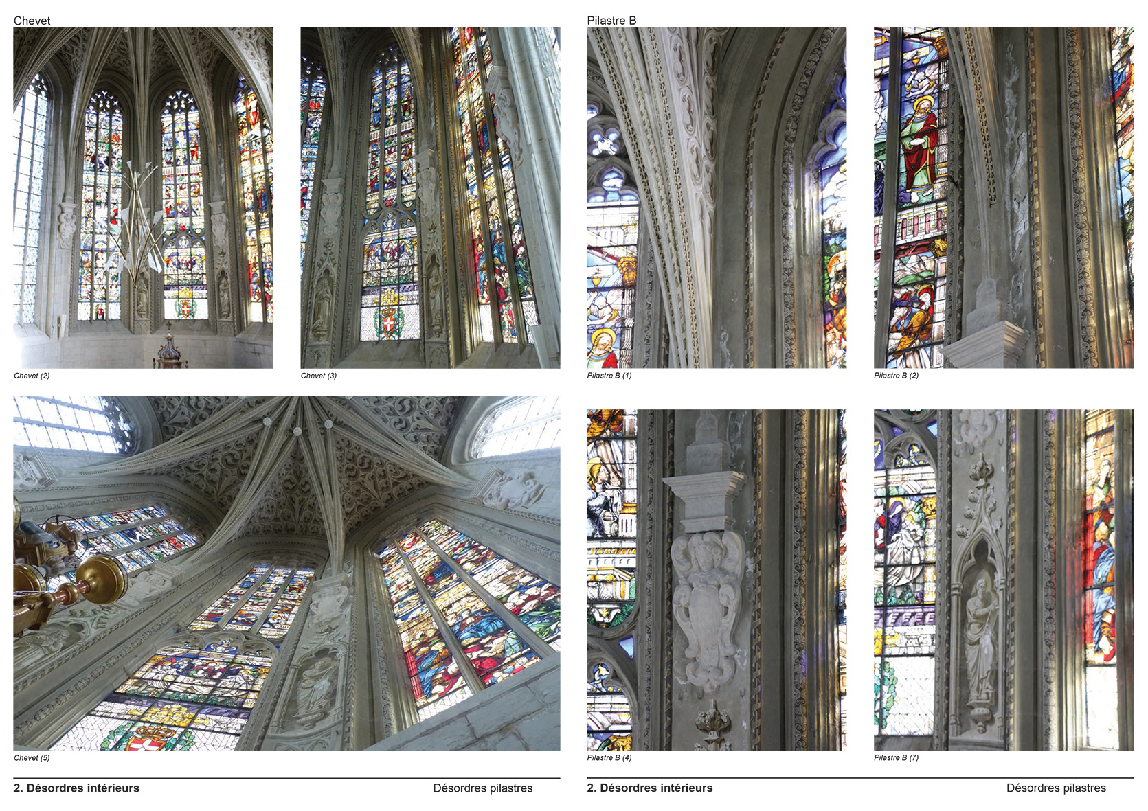 Ce diagnostic est destiné à analyser les désordres et les causes des infiltrations constatées à l’intérieur de l’édifice de la Sainte-Chapelle notamment sur les deux arcs formerets de la travée d’avant chœur et les deux pilastres du chevet du chœur.