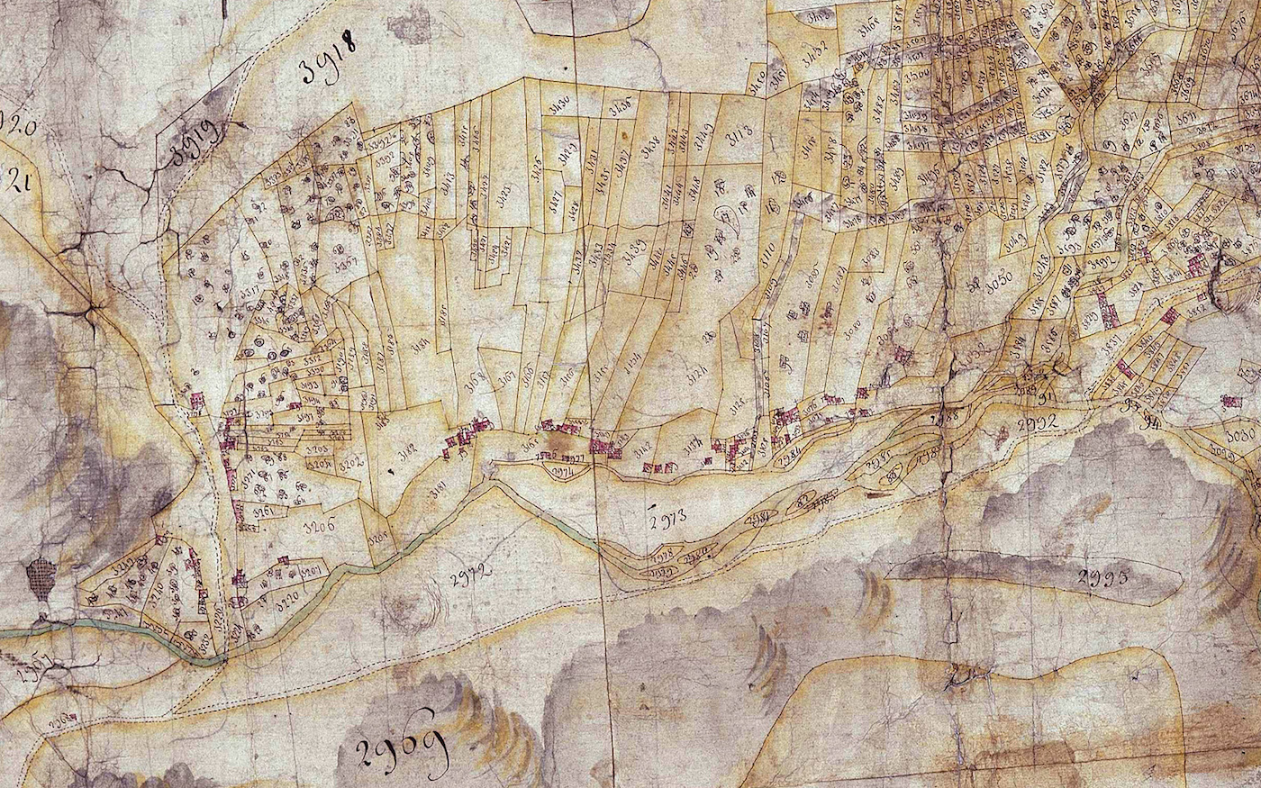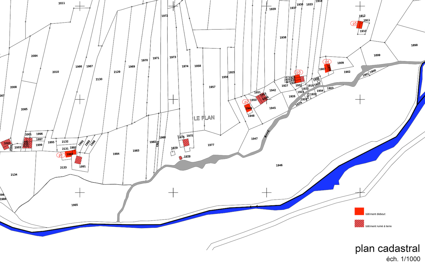 Les documents graphiques inventorient les chalets concernés. Un tableau identifie les parcelles, complété des correspondances avec le 1er cadastre français (1905) et la mappe sarde (1730).