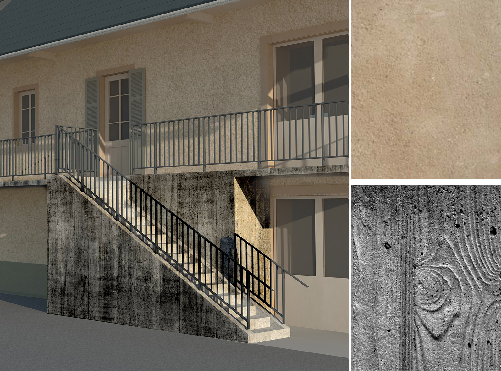 L’escalier d’accès est protégé par un mur d’échiffre rampant, réalisé en béton armé banché par de larges lames de bois préalablement sablées (largeurs aléatoires), rappelant l’esthétique des portes de grange.