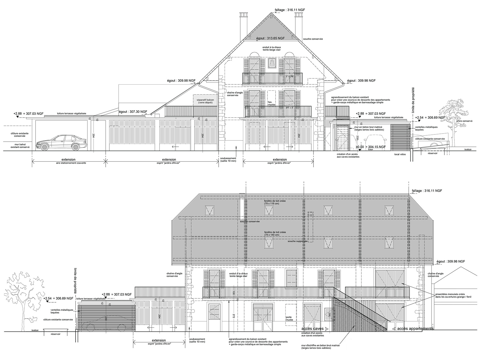 Le projet se propose de réhabiliter le bâtiment, en conservant et en mettant en valeur les éléments architecturaux qui le caractérisent, tout en faisant cohabiter des extensions modérées, conçues en harmonie avec l’existant.