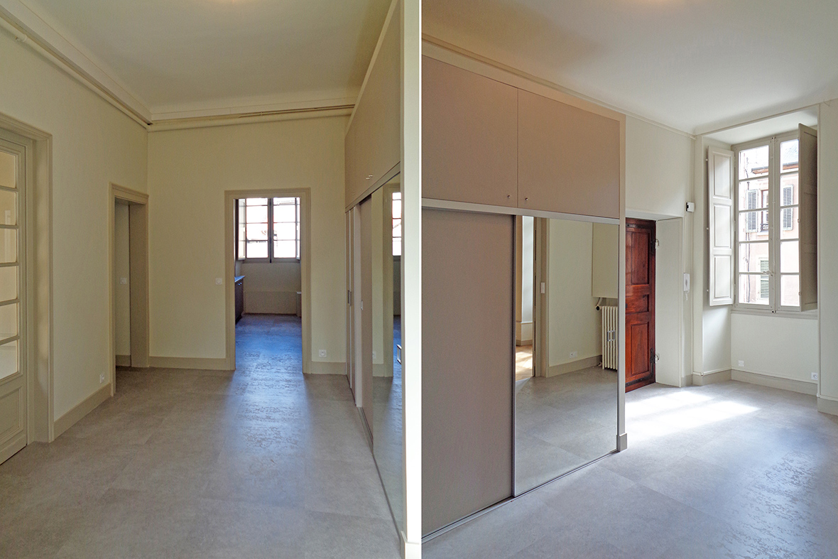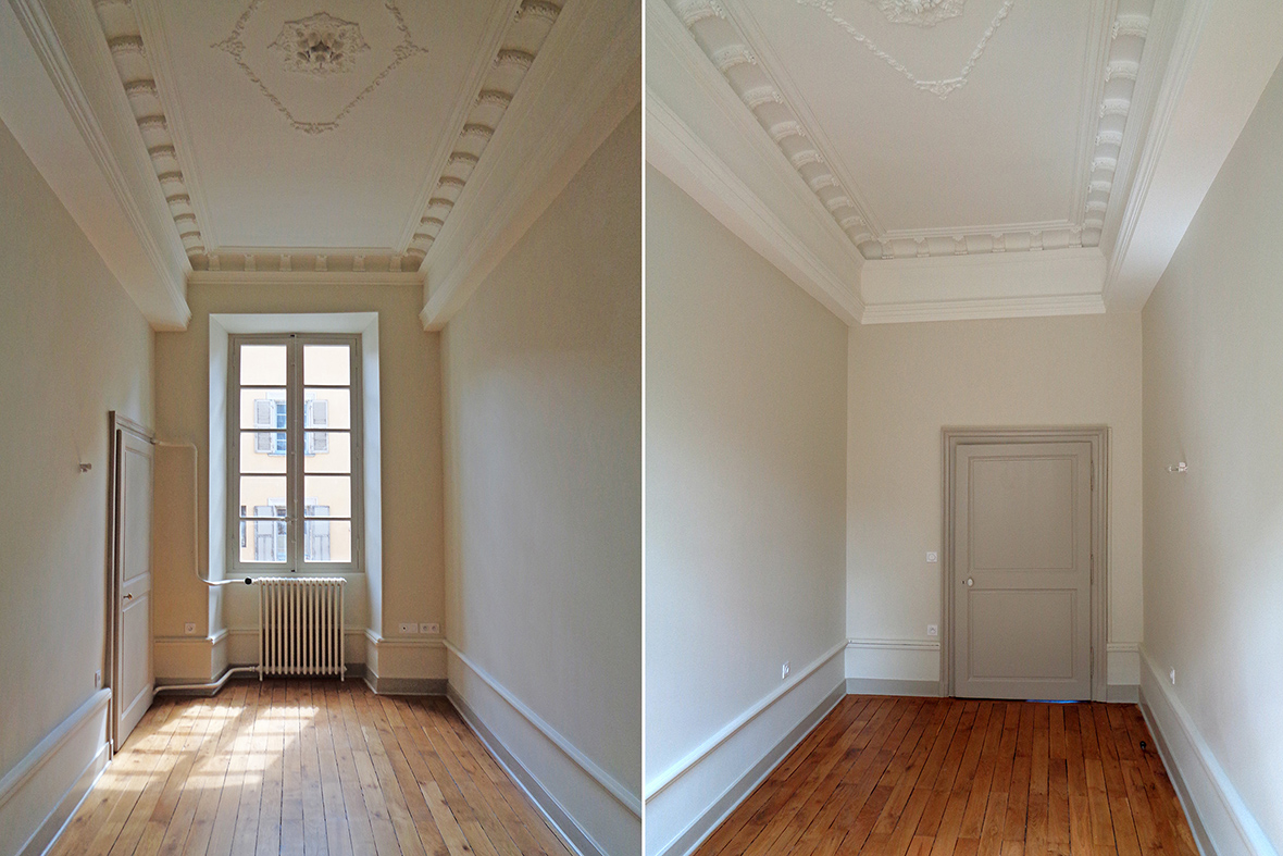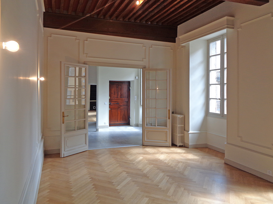 La dernière réhabilitation datant des années 1970, le projet s’est attaché à remettre en valeur les éléments patrimoniaux (parquets, plafond à la française, boiseries, …), tout en développant une fonctionnalité raisonnée des espaces.