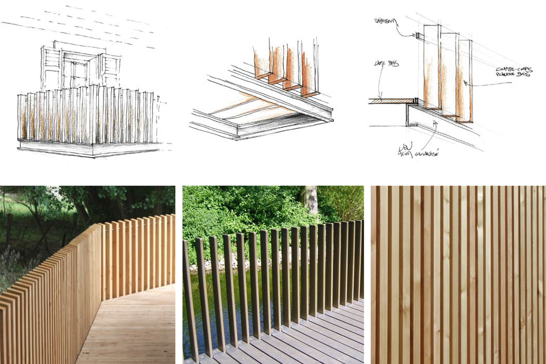Un escalier est créé dans un espace de la dépendance, tandis qu’une partie de l’étage est utilisée en coursive pour desservir les deux logements. Seule une partie du bardage ajouré occultant la dépendance est remplacée par un garde-corps discret.