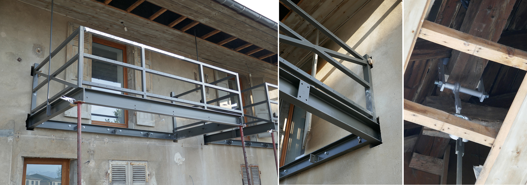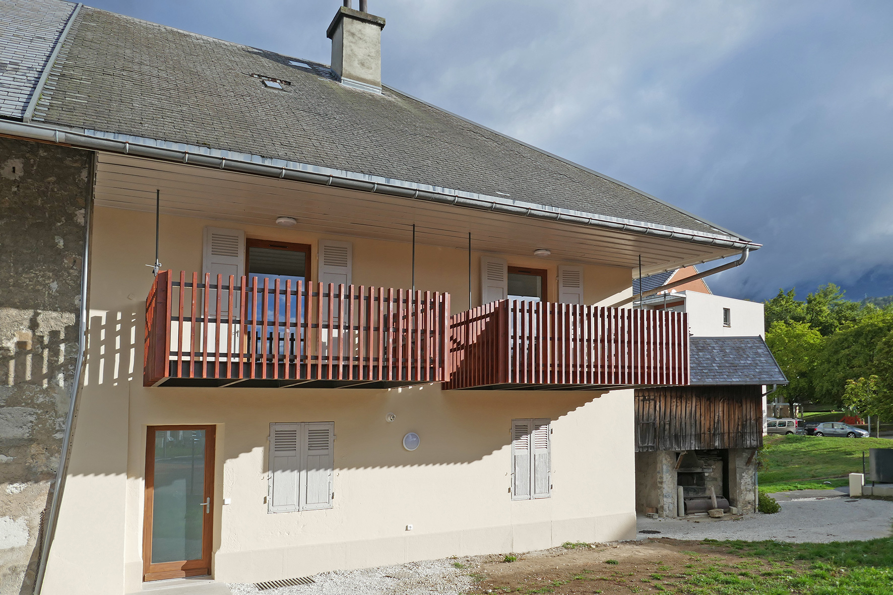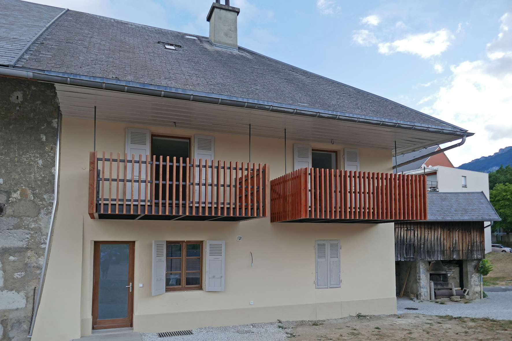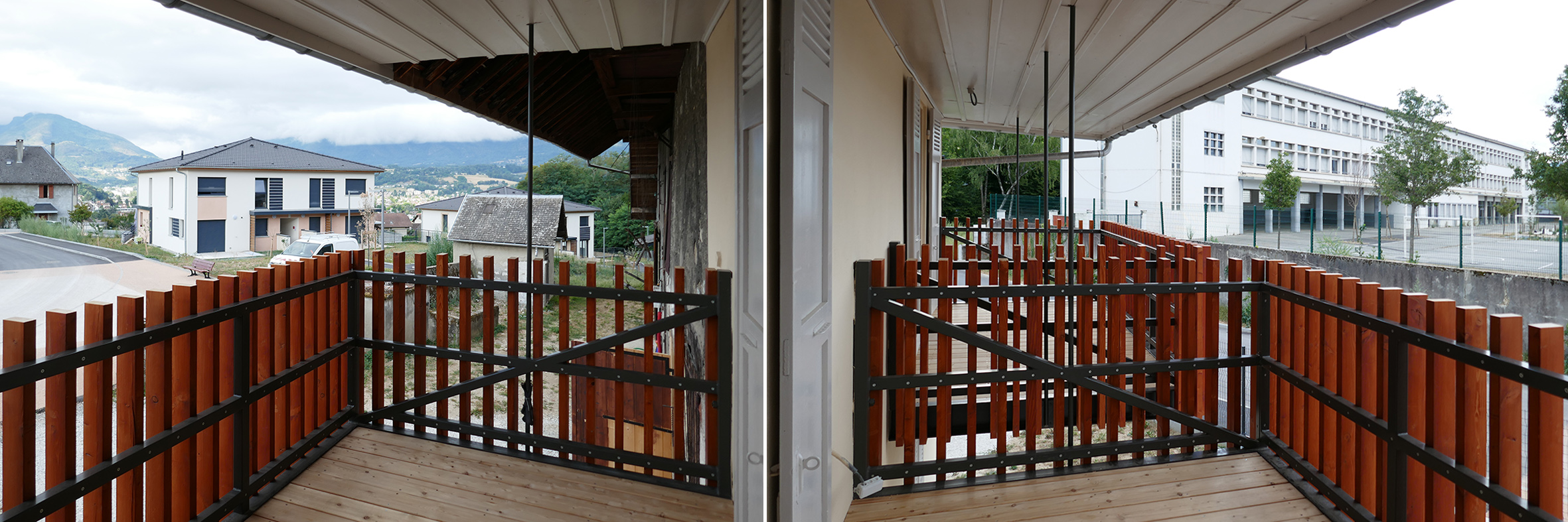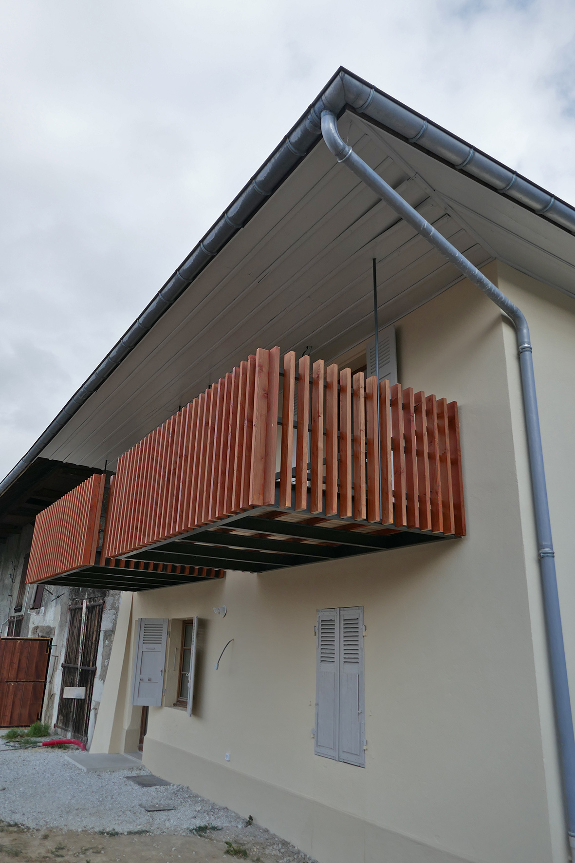 Les deux logements locatifs s’agrémentent d’un espace extérieur, disposé en façade Sud, sous le large avant-toit de la ferme. Ils prennent la forme de balcons suspendus sur une ossature métallique, protégés par un garde-corps en bois.