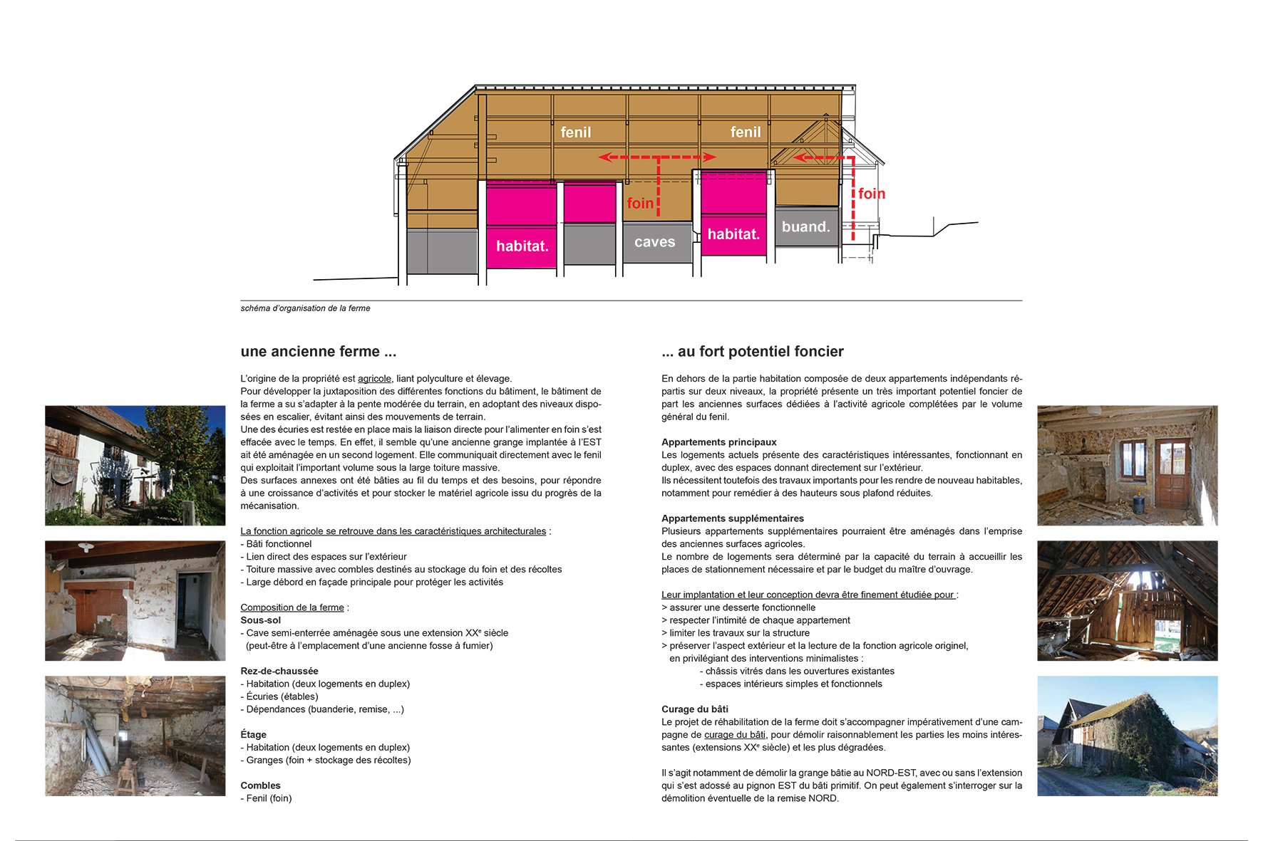 Le projet consiste à réhabiliter le bâtiment existant, dans le respect de ses caractéristiques patrimoniales et historiques. Il propose d’aménager trois appartements destinés à la location traditionnelle, dans l’emprise de l’ancien volume habitable, additionné d’une cave et d’une partie du fenil.