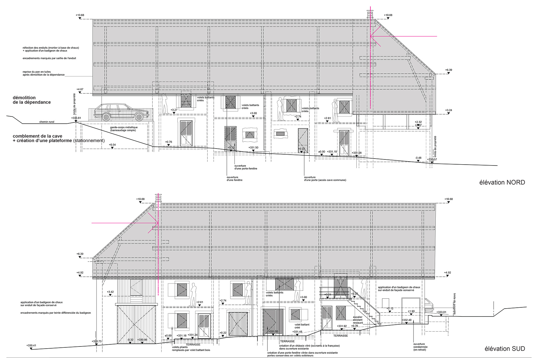 Les très faibles hauteurs sous plafond existantes nécessitent une reprise générale des planchers intermédiaires. Toutefois, le projet s’appuie sur les ouvertures existantes, avec la création limitée de deux ouvertures supplémentaires en façade NORD, respectant l’ordonnancement des ouvertures.