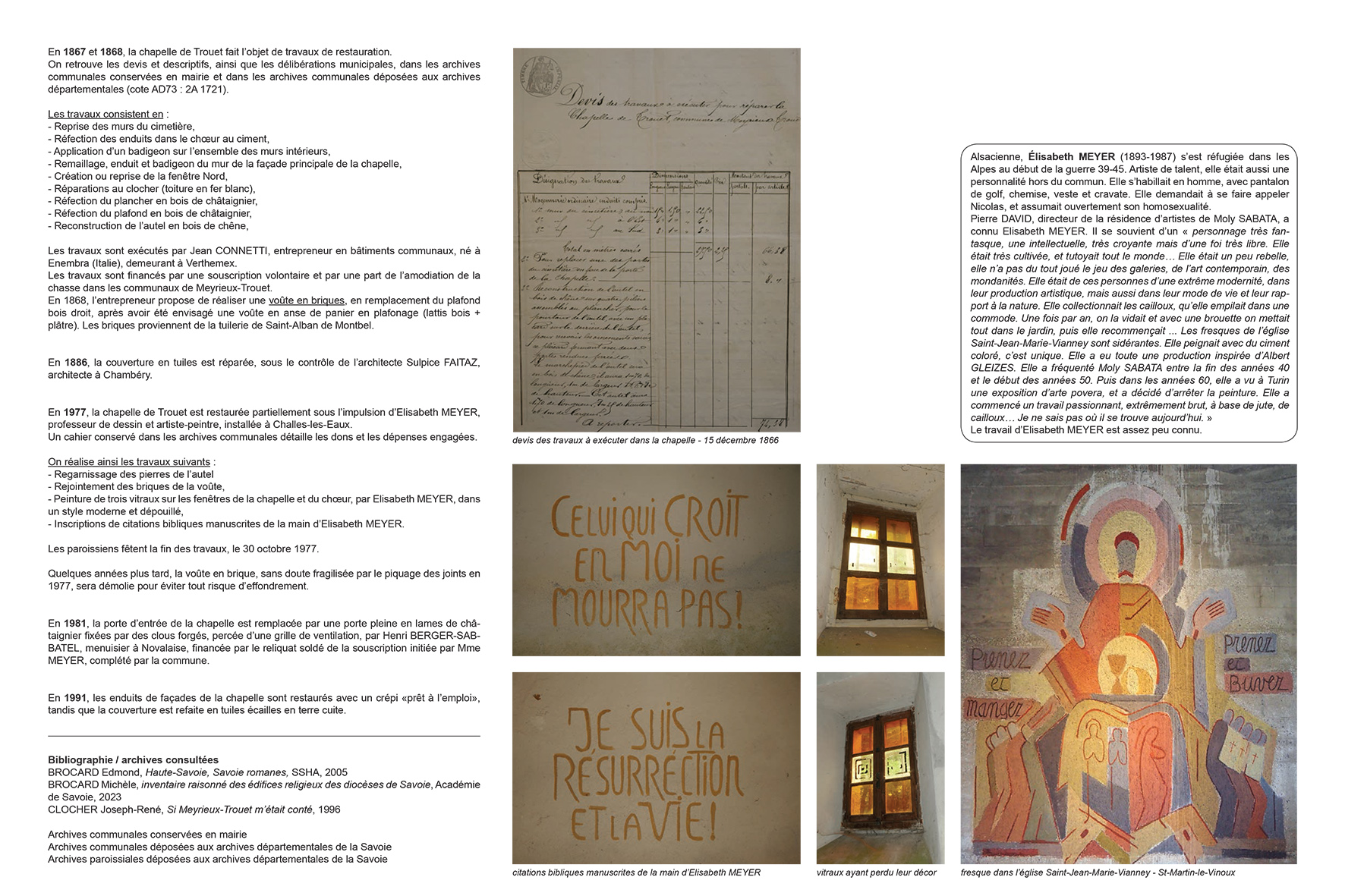En 1977, la chapelle de Trouet est restaurée partiellement sous l’impulsion d’Elisabeth MEYER, professeur de dessin et artiste-peintre, installée à Challes-les-Eaux.