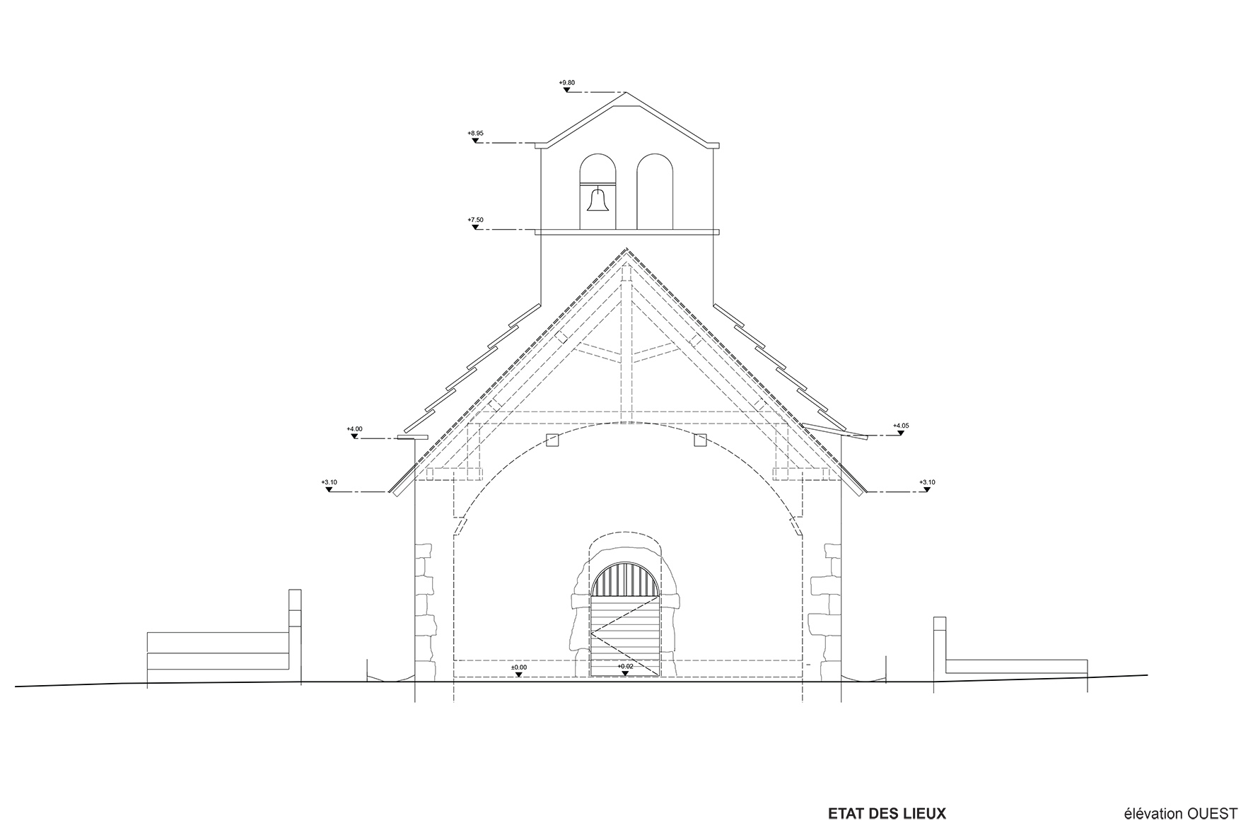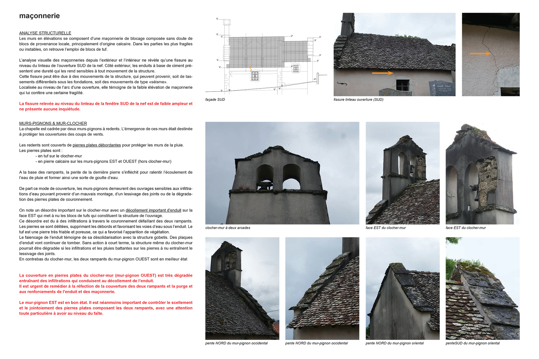 La dégradation des enduits du mur-clocher est due à la détérioration du couronnement en pierres plates fragiles (tuf). La réfection du couronnement doit s’accompagner de la reprise ponctuelle ou complète des enduits de façades avant une réfection plus globale de la façade OUEST. - Le mauvais état de la charpente au droit d’infiltrations contre le mur-pignon OUEST