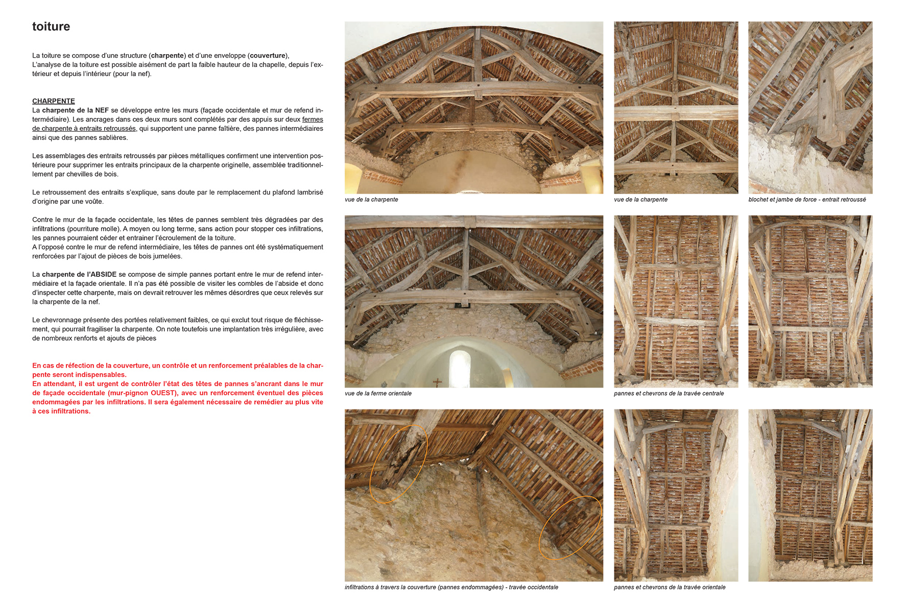 Avec un degré d’urgence plus relatif mais tout aussi prioritaire, il est nécessaire de remédier aux infiltrations à travers la toiture de la chapelle.