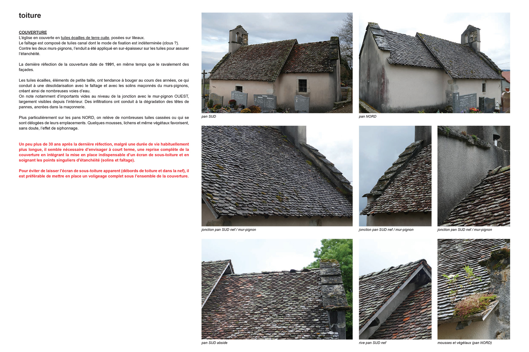 Une intervention ponctuelle peut s’envisager mais elle risque de se confronter à la très grande fragilité des tuiles en terre cuite. Il semble préférable de prévoir dès à présent une réfection complète de la couverture de la nef et du chœur.