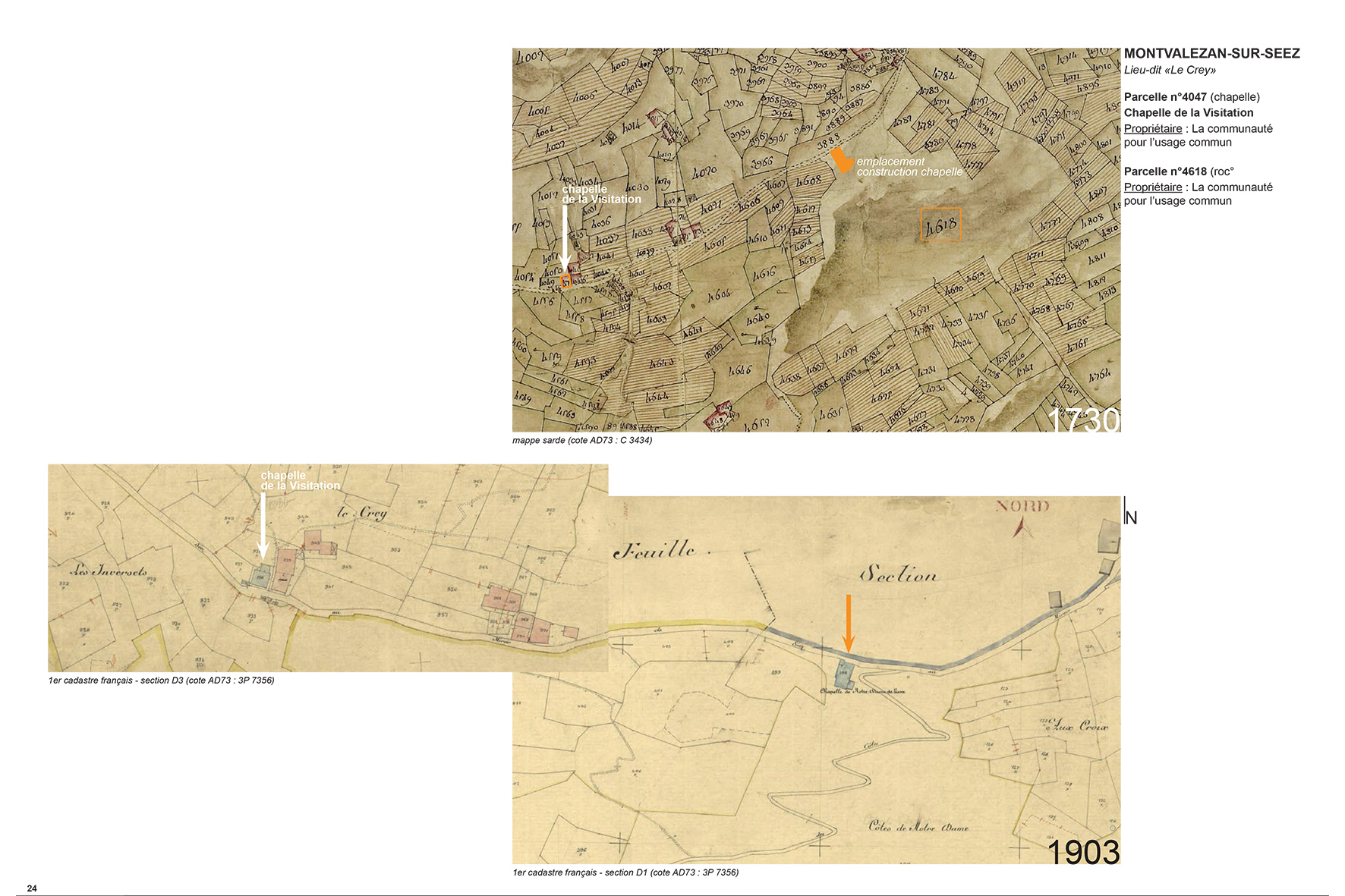 Il existe une première chapelle dans le hameau du Crey, attestée dès 1633, date de la visite pastorale de Monseigneur De CHEVRON-VILLETTE, qui cite la chapelle Sainte-Marie érigée au Crey, dépendant de l’église paroissiale. Elle apparaît également sur la Mappe Sarde de 1730, sous le numéro de parcelle 4047 (chapelle de la Visitation). Elle existait jusqu’en 1828.