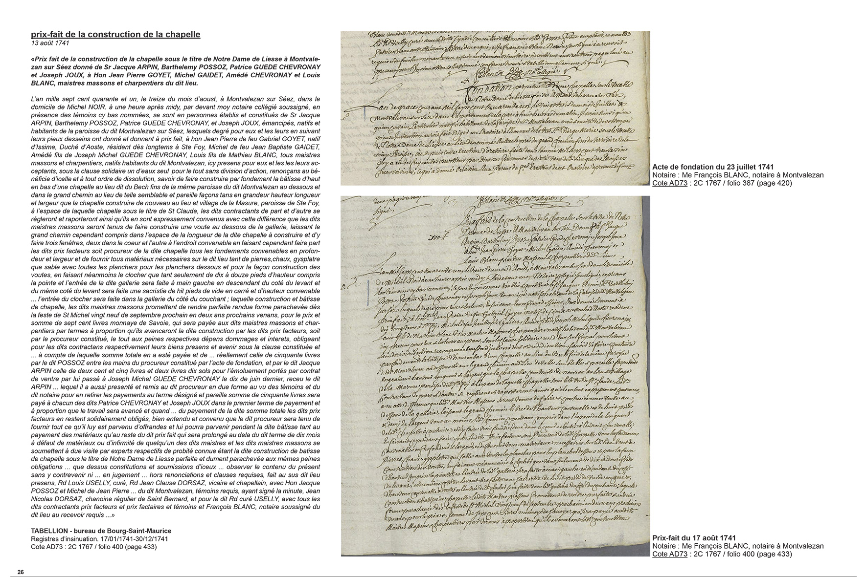 Le prix-fait du 13 août 1741 décrit avec précision les travaux commandés par les membres de la communauté du Crey (Jacque ARPIN, Barthelemy POSSOZ, Patrice GUEDE CHEVRONAY, et Joseph JOUX) aux maistres massons et charpentiers (Jean Pierre GOYET, Michel GAIDET, Amédé GUEDE CHEVRONAY, Louis BLANC).