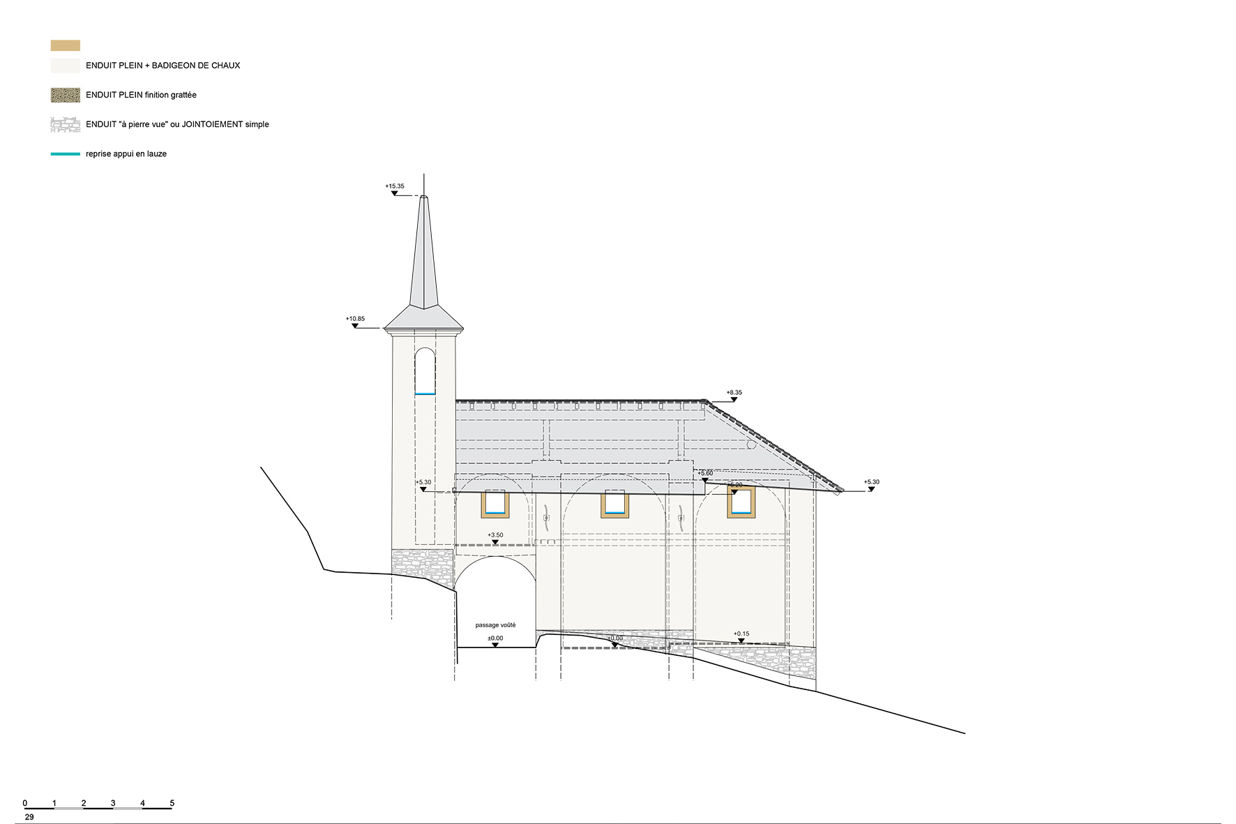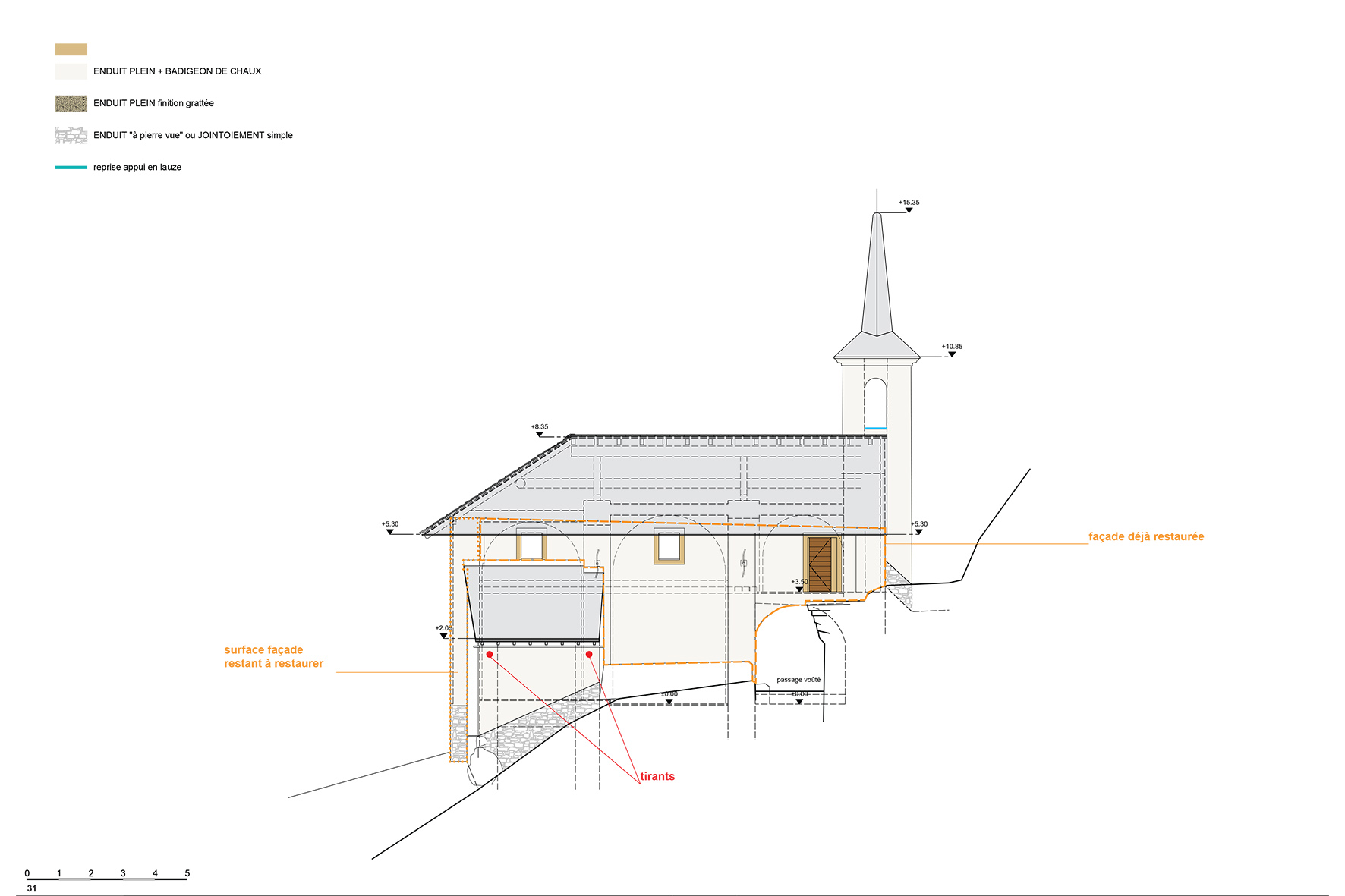 Le projet consiste à poursuivre la la réfection des enduits de façades, déjà initiée sur la façade OUEST et dans le passage voûté, avant l’application d’un badigeon. Les parties basses font l’objet d’une finition moins couvrante afin de rendre les maçonneries moins sensibles aux remontées capillaires (humidité). Préalablement des tirants sont mis en place sur la sacristie pour remédier aux désordres liés aux tassements différentiels.