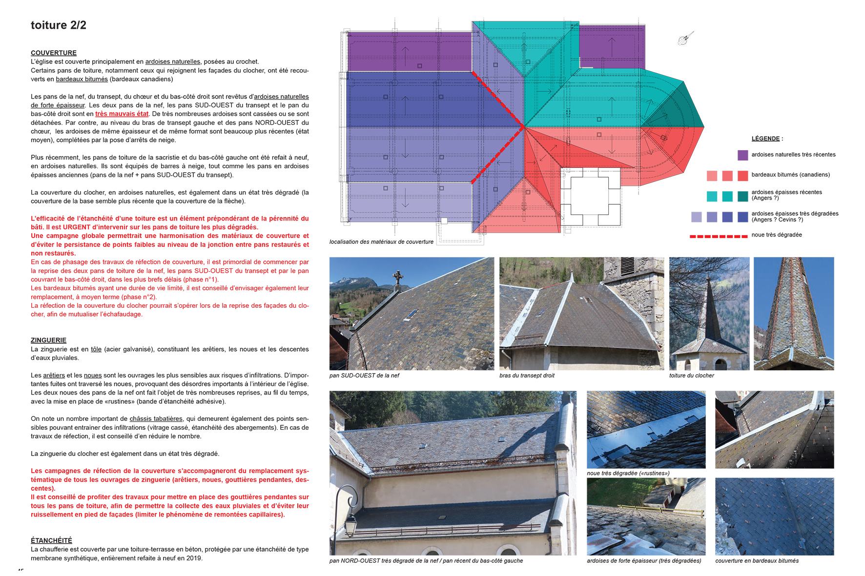 Il semble important d’envisager, à très brève échéance, une première phase de travaux comprenant la réfection de la couverture des deux pans de la nef, des pans Sud-Ouest du transept et du pan du bas-côté droit, qui se relèvent être dans un état passable. Idéalement, il faudrait l’accompagner de la réfection de tous les pans couverts en bardeaux bitumés (pans Sud-Est et pan Nord-Est du bras de transept droit et des pans Sud-Est du chœur), ce qui permettrait de traiter efficacement tous les points de liaison.