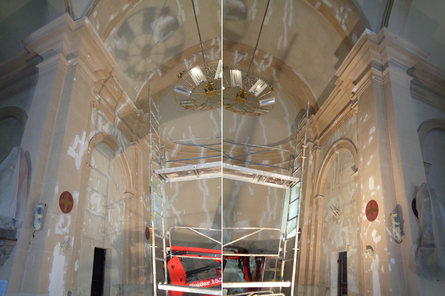 La campagne de réfection du chœur consiste à appliquer un badigeon à la chaux sur les murs, voûtes et modénatures après des travaux préparatoires de traitement des micro-fissures et des supports. Le mur en pierres apparentes est conservé.