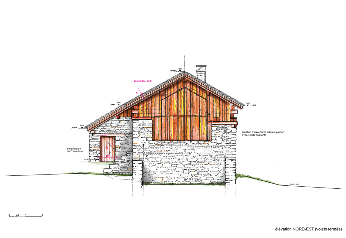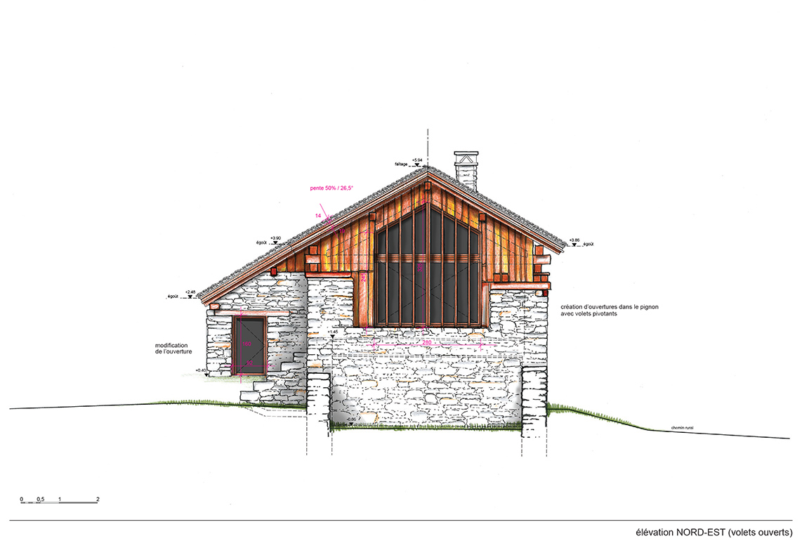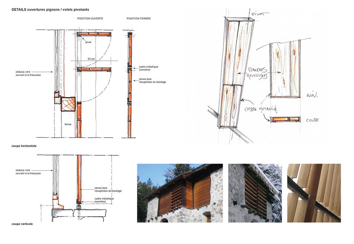Pour faire rentrer la lumière au coeur du chalet, il est proposé de créer des ouvertures largement vitrées disposées en retrait des fermes des deux pignons. Pour en assurer une insertion la plus discrète possible, le projet propose de les dissimuler derrière des volets pivotants constitués d’un cadre réalisé en cornière métallique recevant un remplissage en bois composé des planches de bardage récupérées. En position fermée, la perception du mantelage bois est scrupuleusement préservée. Tandis qu’en position ouverte, les surfaces vitrées se cachent derrière un alignement ajouré.