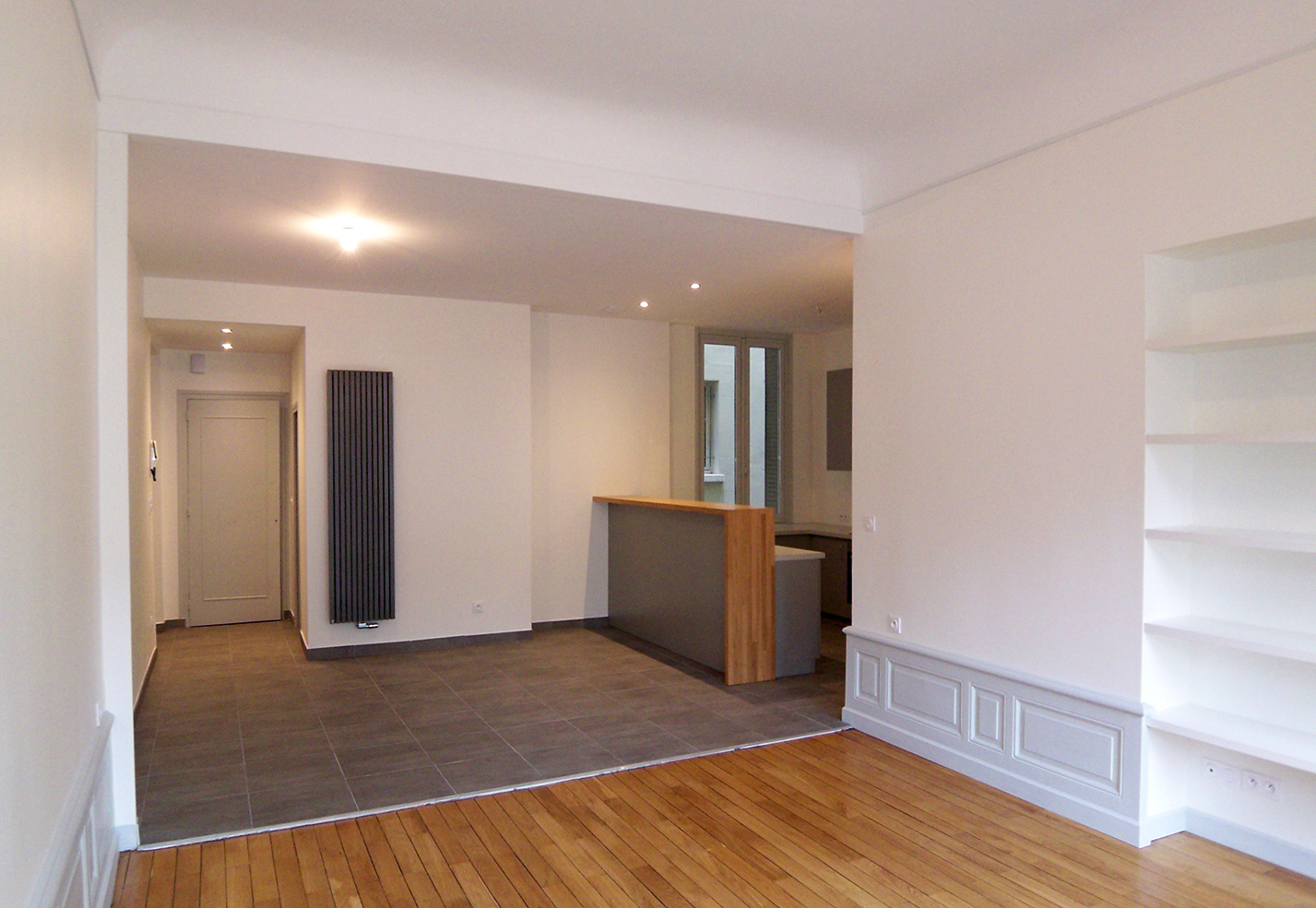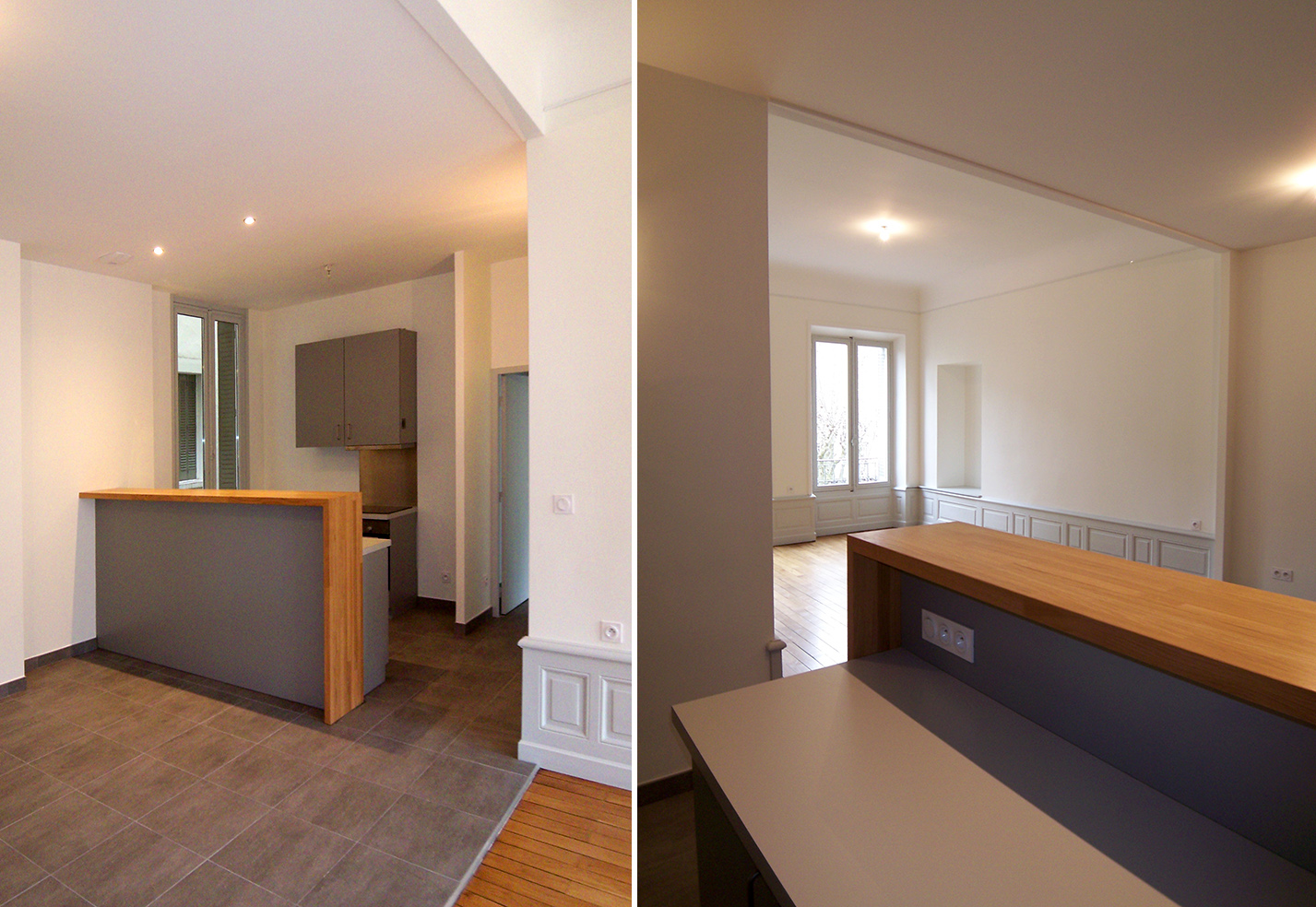 Le projet s’est donc attaché à remettre en valeur les éléments patrimoniaux (parquets, carrelage, …), tout en développant une fonctionnalité raisonnée des espaces.