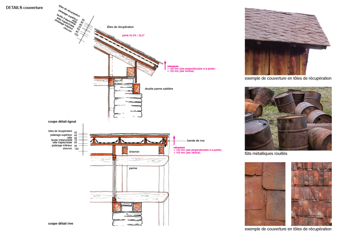 Le projet propose de perpétuer le témoignage de la double activité des alpagistes au tournant de l’ère industrielle, en retenant la mise en œuvre de fonds de fûts métalliques, fixées par clouage sur le platelage formant pare-neige.