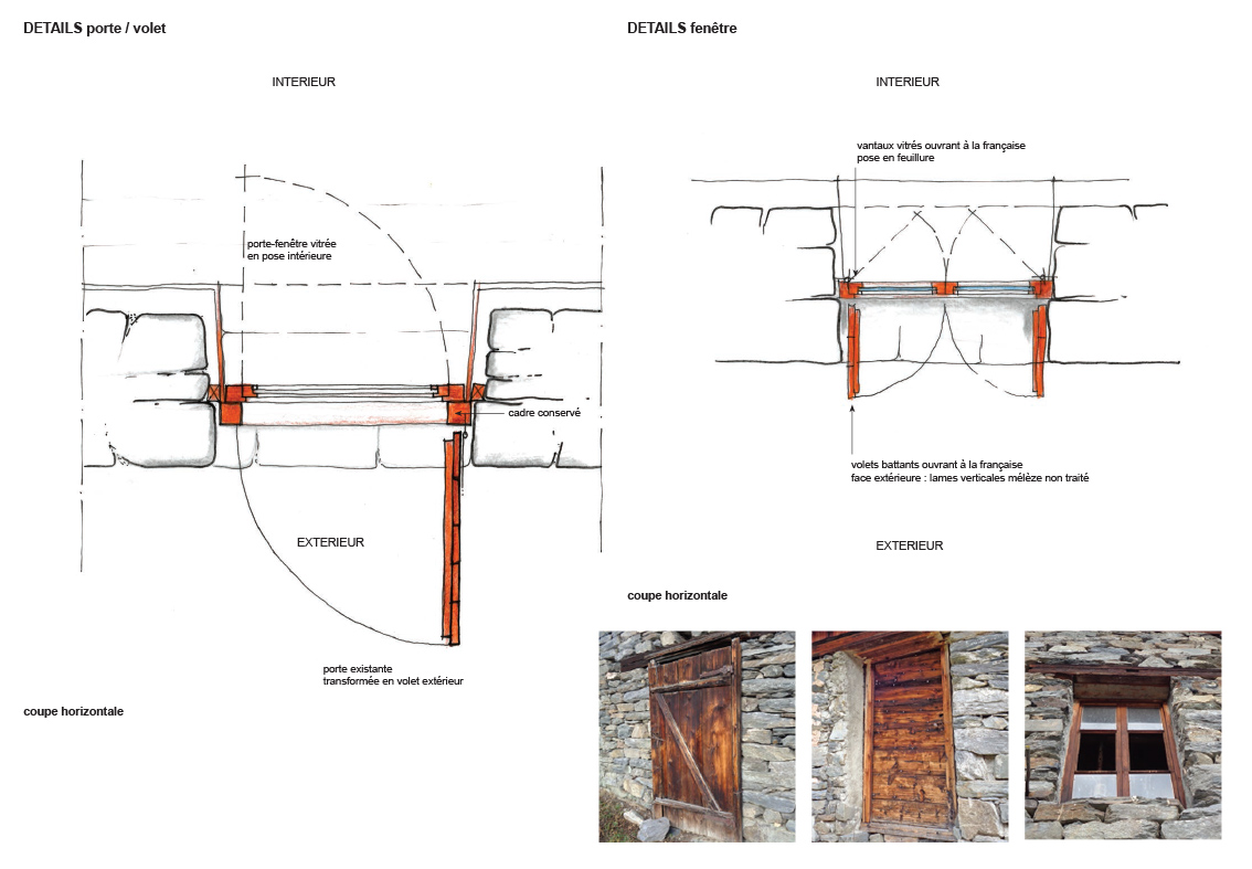 Le projet propose de conserver intégralement l’ensemble des portes, en les transformant en volets extérieurs, tout en intégrant des portes-fenêtres vitrées à l’intérieur.