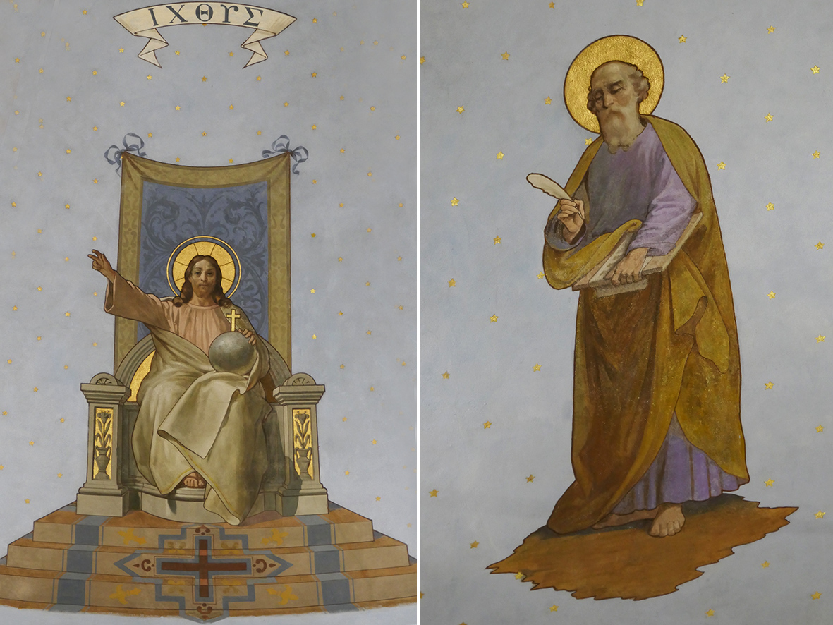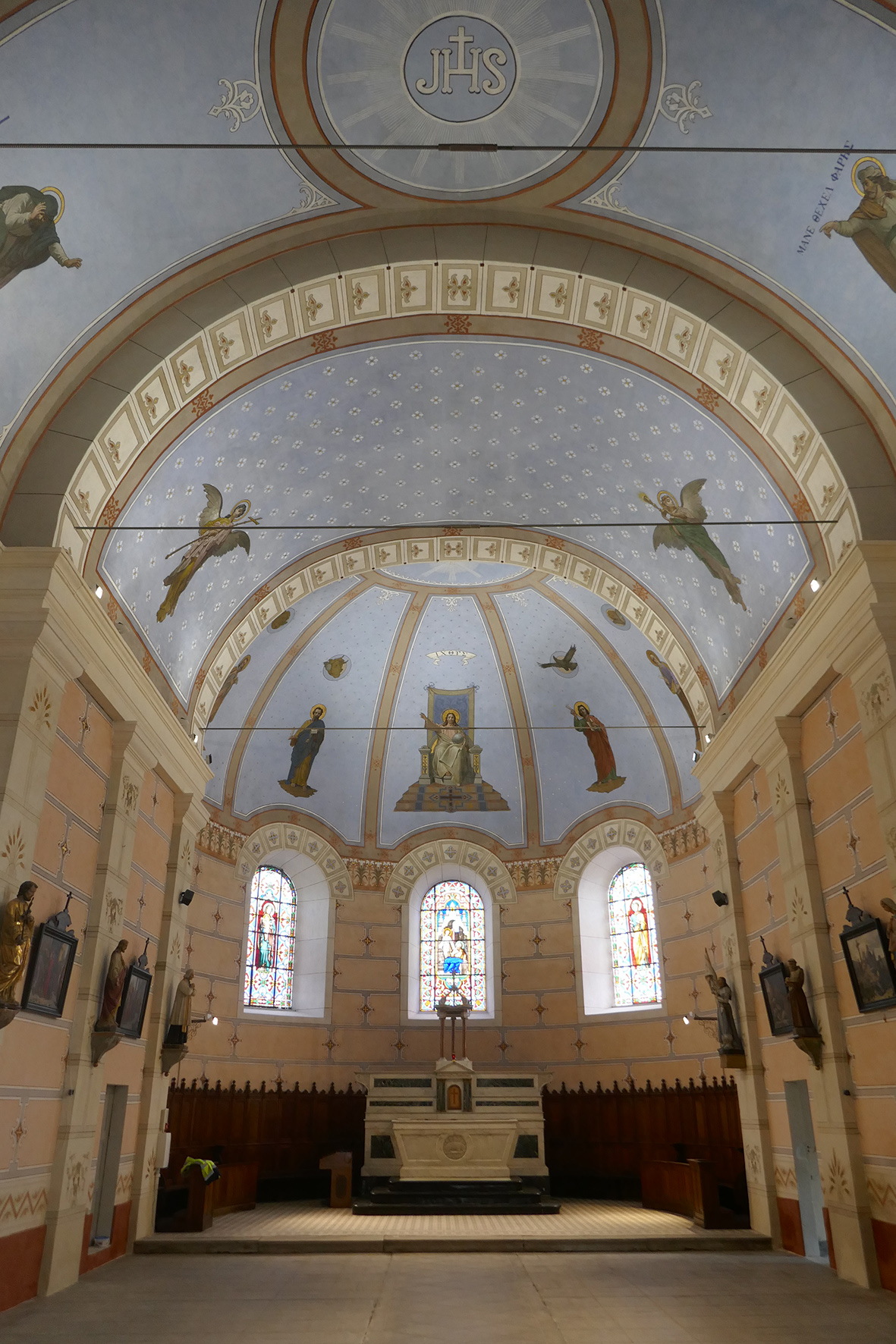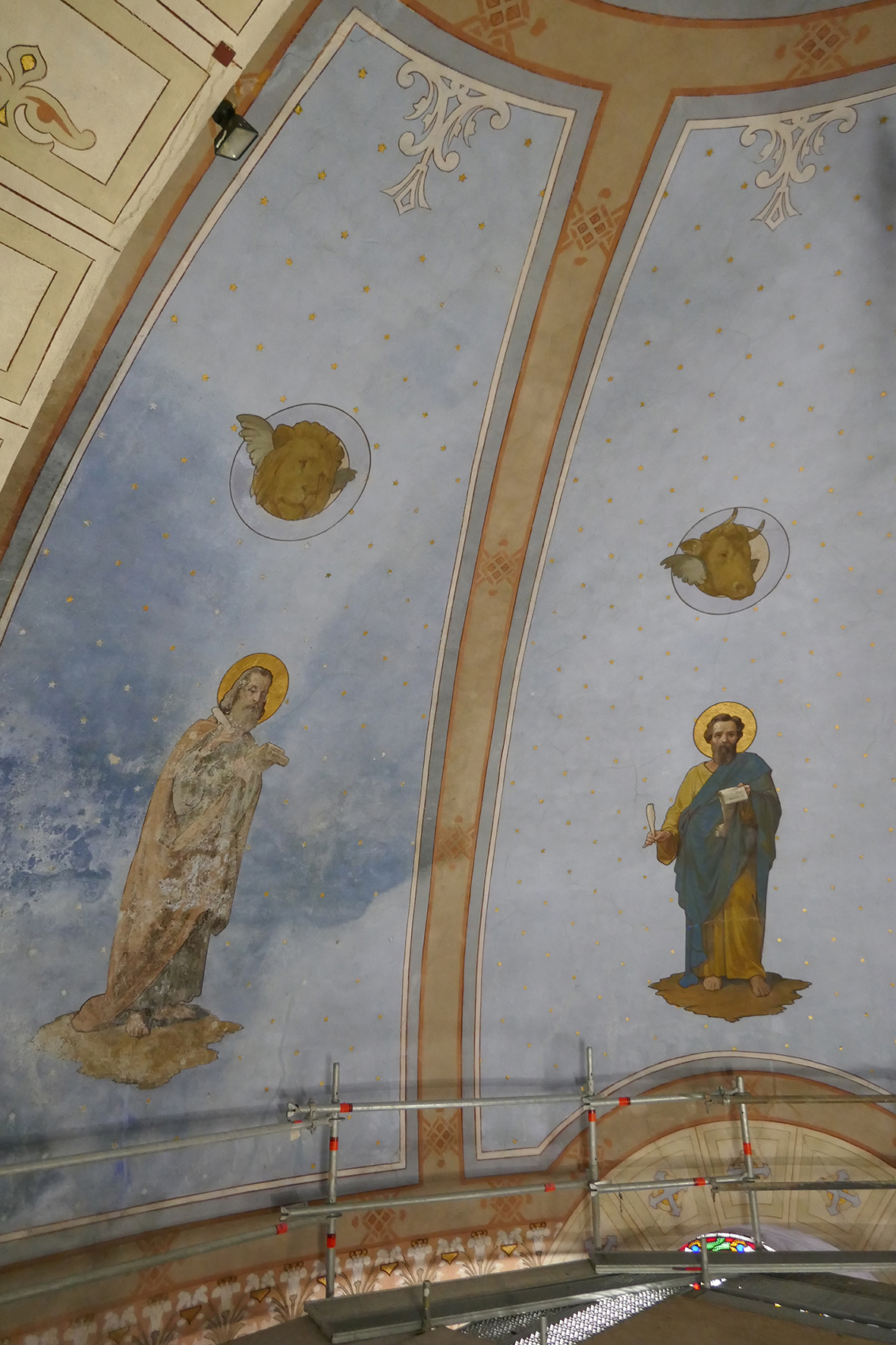 La voûte du chœur est en cul de four avec pour décor la découpe de cinq panneaux. Le registre décoré de la voûte reprend la composition des autres travées : panneau bleu ciel, arête gris brun, entrelacs brun rouge, etc…). Le décor de l’arc triomphal (arc doubleau) reprend le fond jaune pâle avec un décor de caisson gris pâle et un élégant entrelacs de feuille. Au centre des cinq panneaux le Christ en gloire sur son trône avec un phylactère avec le chrisme monogramme du Christ (Ichyhys) peut être en grec. Puis de gauche à droite, les quatre évangélistes avec leurs attributs soit saint Marc avec son Lion, Saint Luc avec son Bœuf (un bœuf couché lui sert de pupitre), saint Jean avec son Aigle, et Saint Matthieu avec son ange (il écrit sous l’inspiration d’un ange).