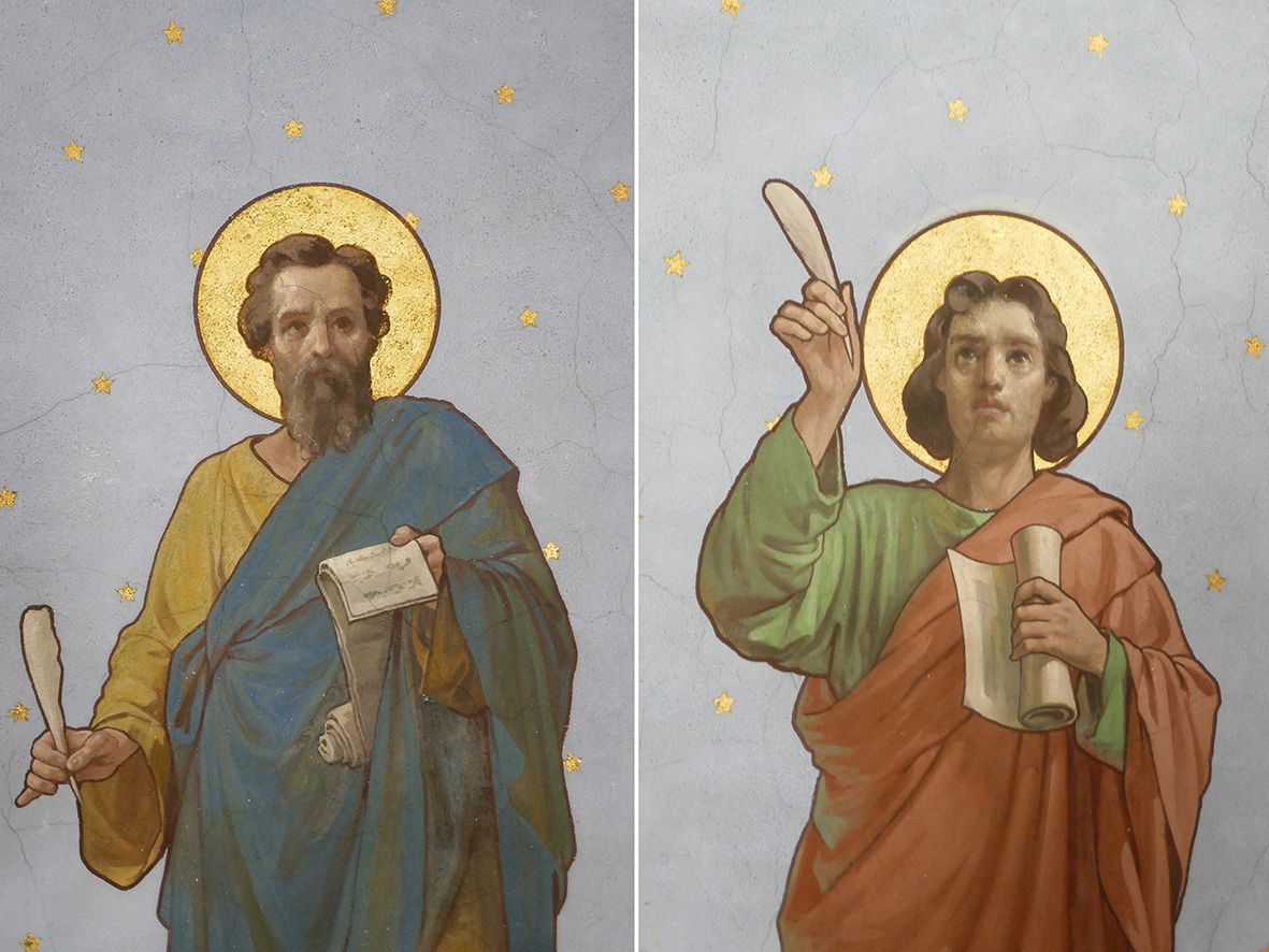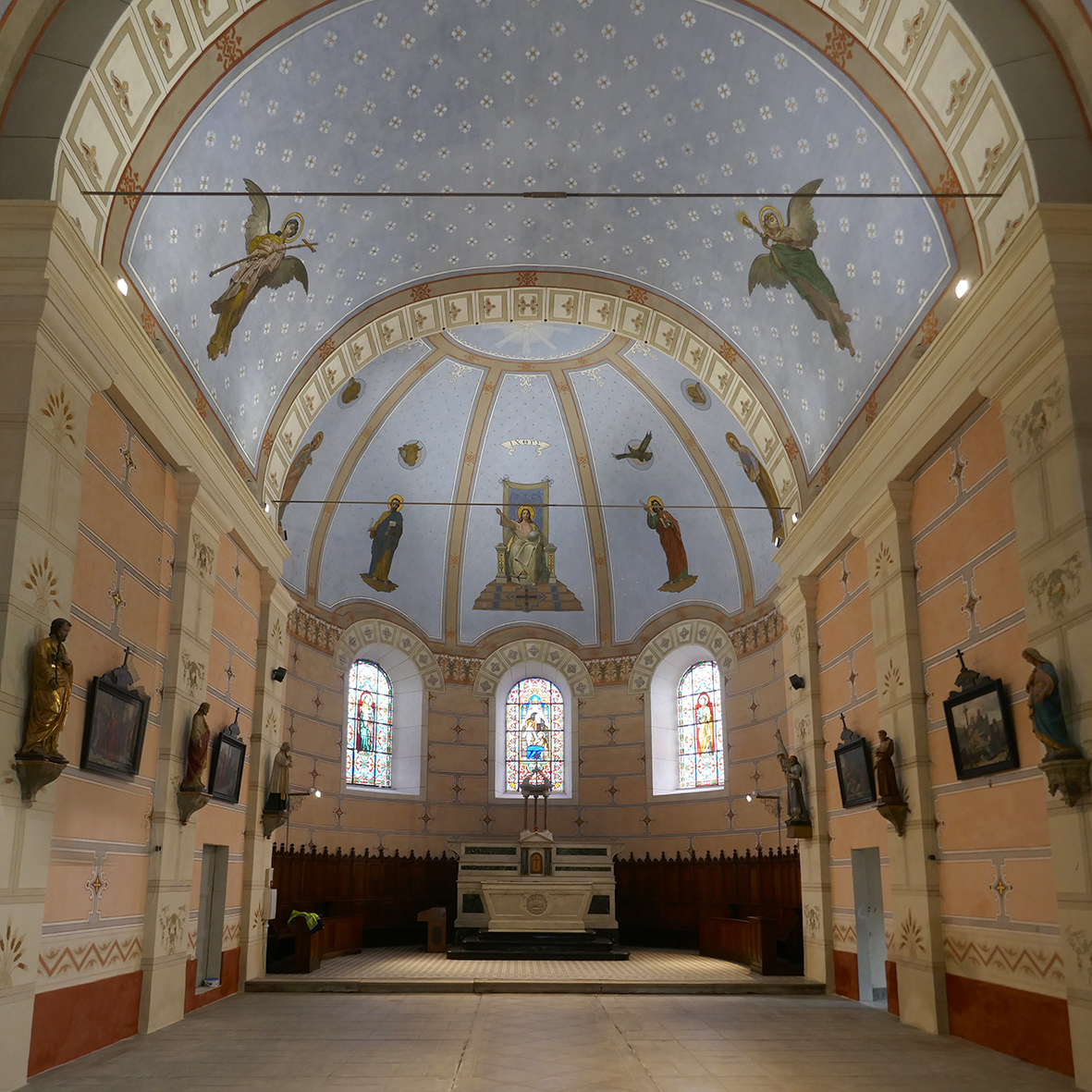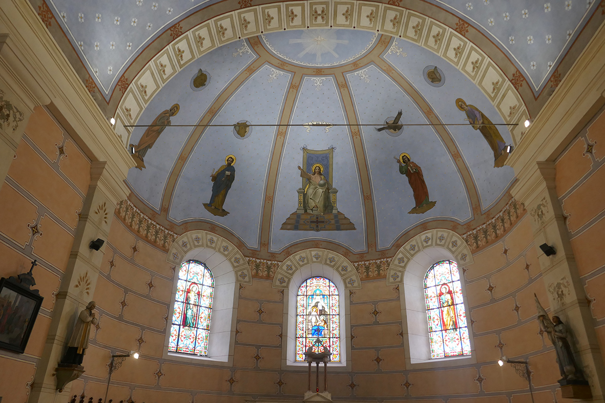 La voûte du chœur est en cul de four avec pour décor la découpe de cinq panneaux. Le registre décoré de la voûte reprend la composition des autres travées : panneau bleu ciel, arête gris brun, entrelacs brun rouge, etc…). Le décor de l’arc triomphal (arc doubleau) reprend le fond jaune pâle avec un décor de caisson gris pâle et un élégant entrelacs de feuille. Au centre des cinq panneaux le Christ en gloire sur son trône avec un phylactère avec le chrisme monogramme du Christ (Ichyhys) peut être en grec. Puis de gauche à droite, les quatre évangélistes avec leurs attributs soit saint Marc avec son Lion, Saint Luc avec son Bœuf (un bœuf couché lui sert de pupitre), saint Jean avec son Aigle, et Saint Matthieu avec son ange (il écrit sous l’inspiration d’un ange).