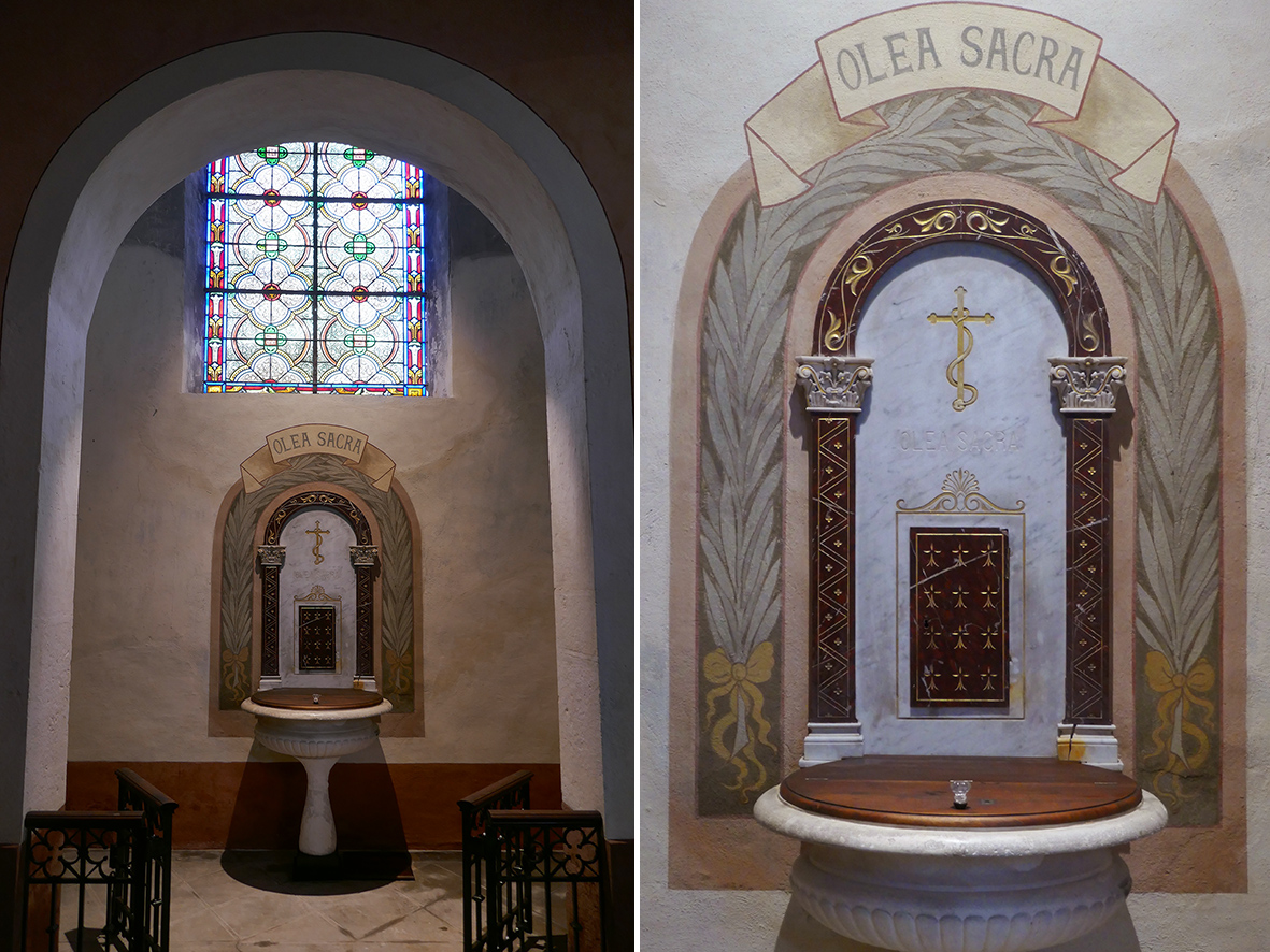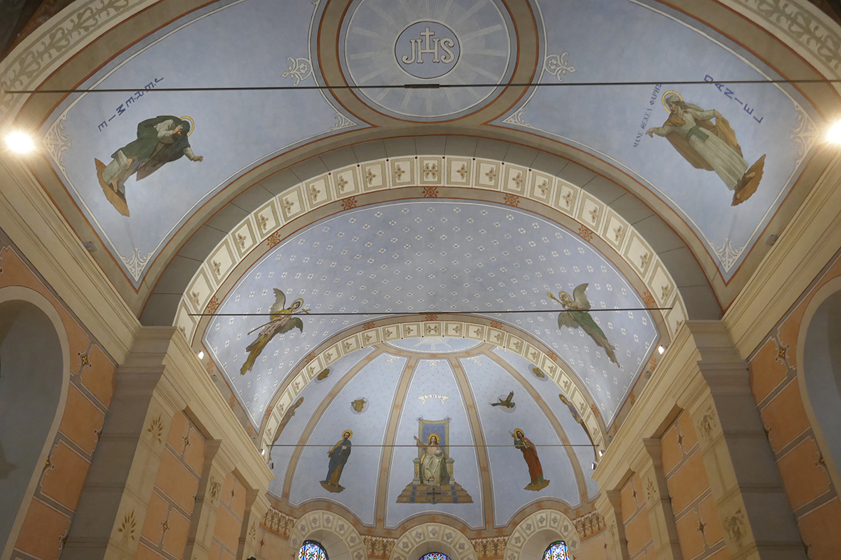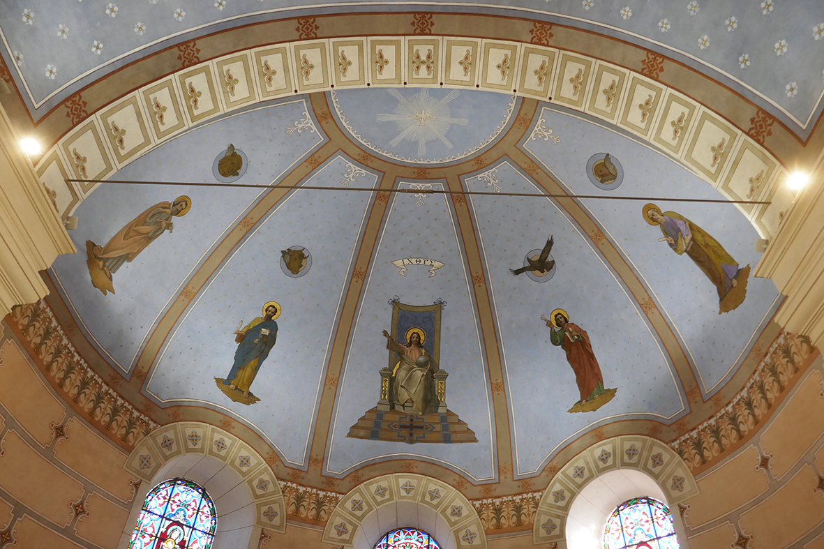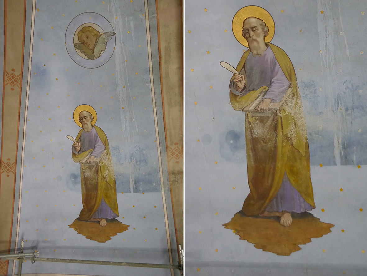 5ème travée (avant-choeur) : Ce panneau de voûte est encadré d’un premier filet bleu ciel soutenu de filet brun rouge et d’une bande plus large de teinte gris brun. A la base de ce panneau deux Anges sont représentés avec sur la gauche un ange aux ailes déployées portant une longue croix latine et, sur la droite, un ange aux ailes déployées également présentant un calice d’où apparait une Hostie nimbée de lumière.