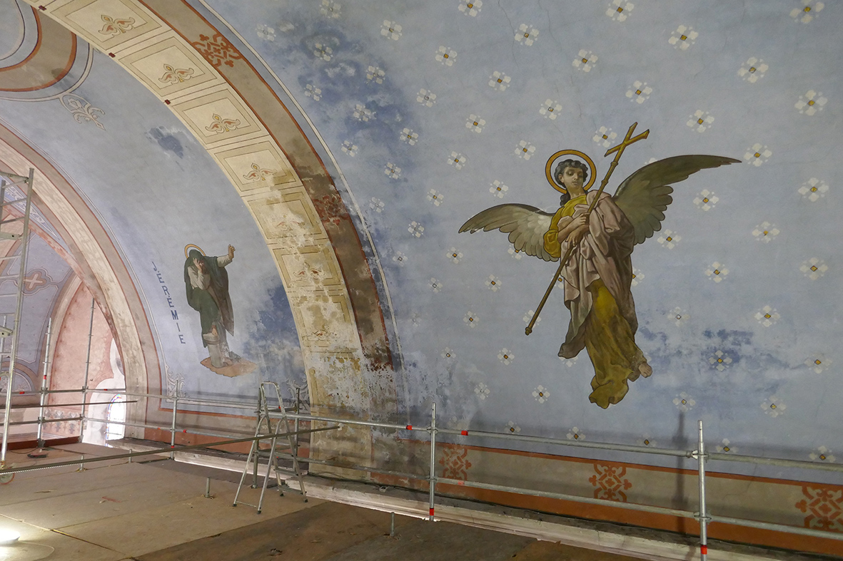 Cette première tranche de travaux consiste à restaurer les enduits et peinture murales des 4ème et 5ème (avant-chœur) travées et du chœur, dégradés par d’anciennes infiltrations aujourd’hui traitées.