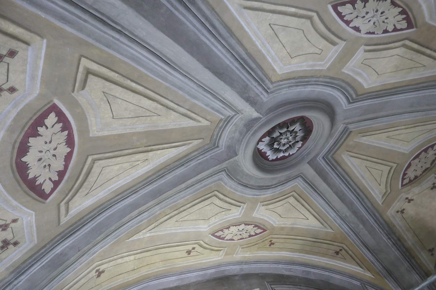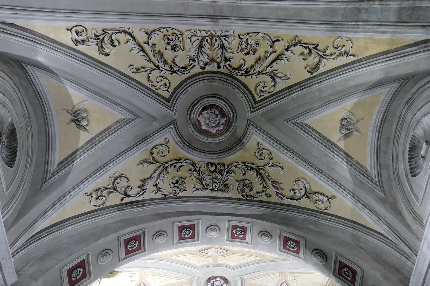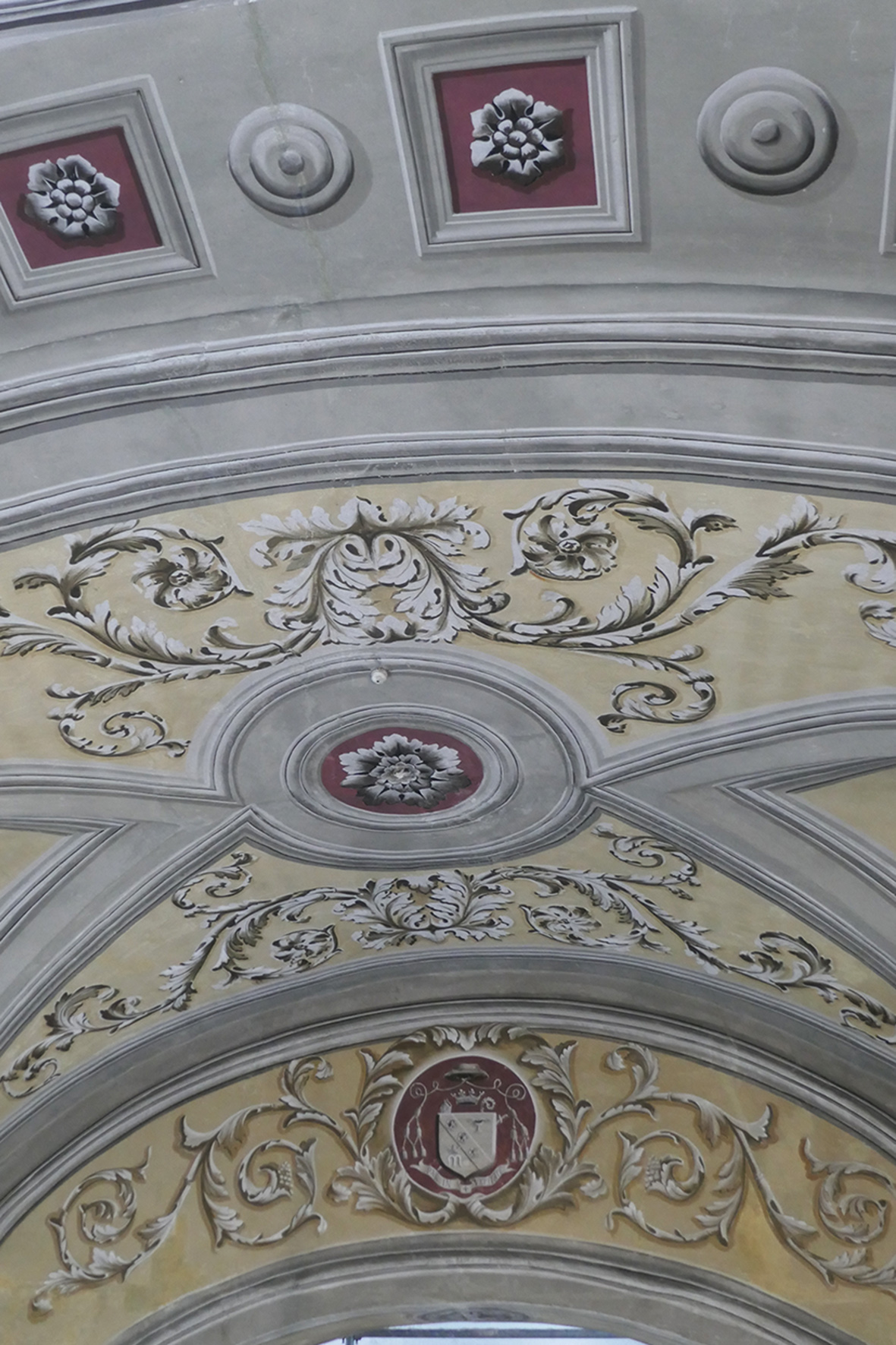 Les voûtes reçoivent un décor de rinceaux et de feuillage en enroulement dans des panneaux marquant les quartiers de voûtes dans les tonalités de gris clair, d’ocre jaune, d’ocre brun et d’ocre brun lie de vin, avec des enroulements de feuillage blanc crème.. Ceci se retrouve pour le décor sous la tribune avec au centre des médaillons armoriés et pour les voûtes de la tribune. Ce décor de Dante MACCHIONE de 1926 reprend en grande partie le décor précédent de 1856.