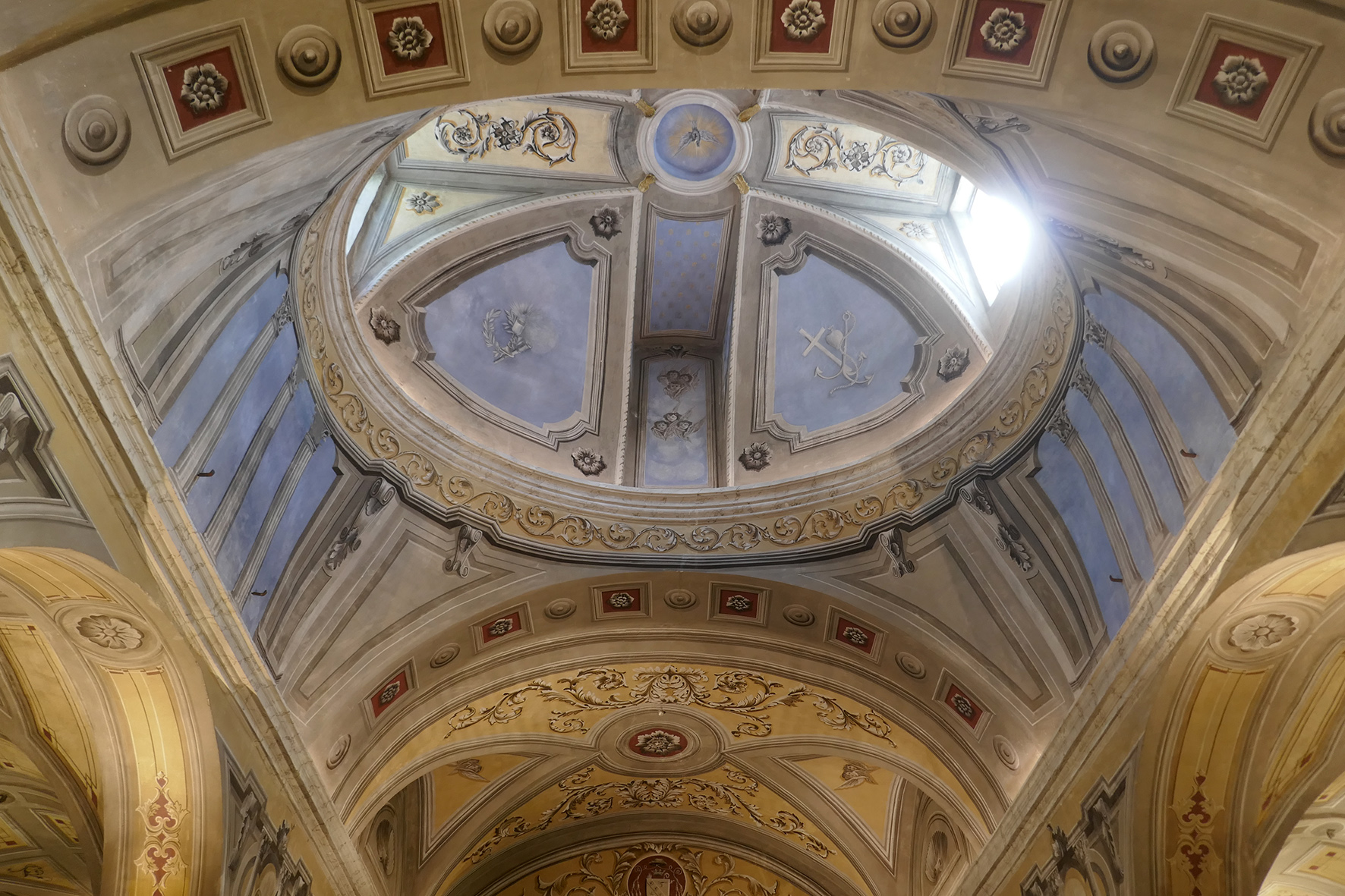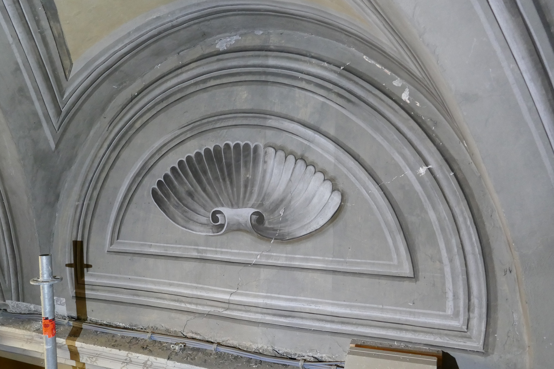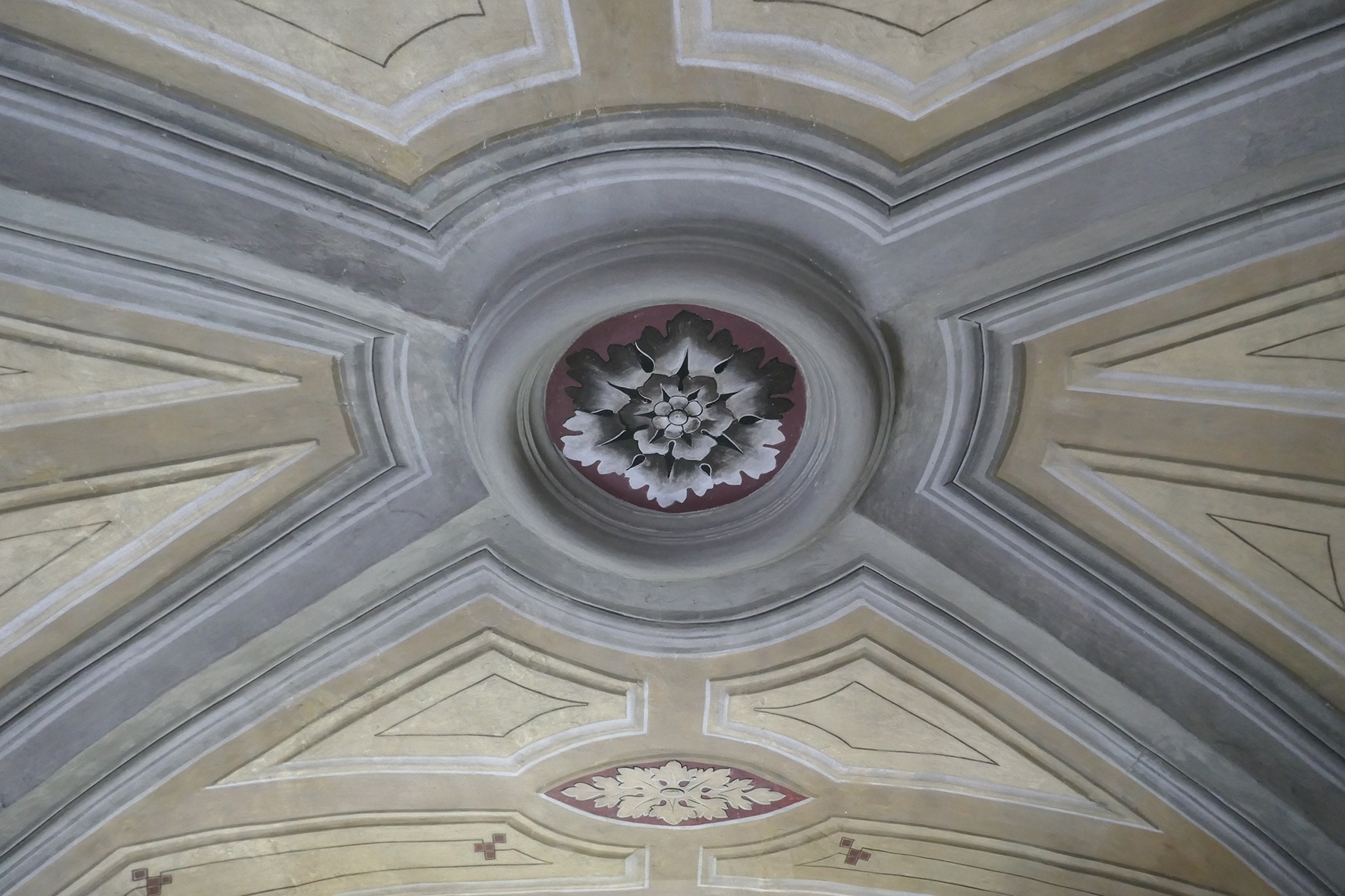 Les voûtes reçoivent un décor de rinceaux et de feuillage en enroulement dans des panneaux marquant les quartiers de voûtes dans les tonalités de gris clair, d’ocre jaune, d’ocre brun et d’ocre brun lie de vin, avec des enroulements de feuillage blanc crème.. Ceci se retrouve pour le décor sous la tribune avec au centre des médaillons armoriés et pour les voûtes de la tribune. Ce décor de Dante MACCHIONE de 1926 reprend en grande partie le décor précédent de 1856.