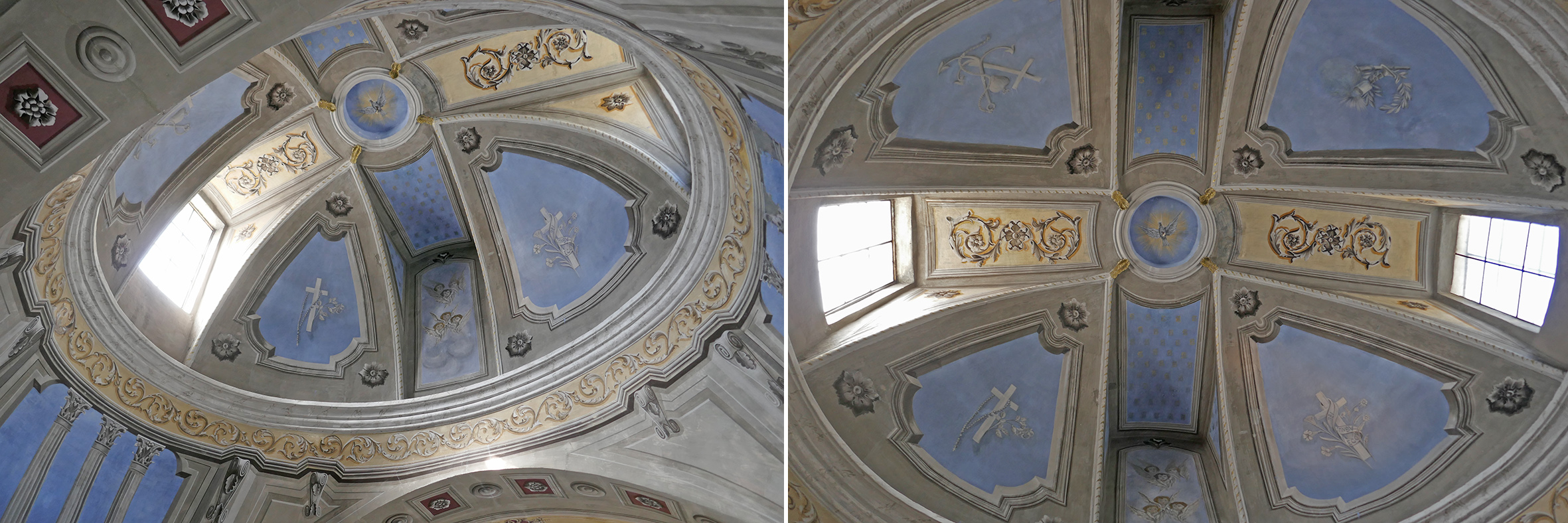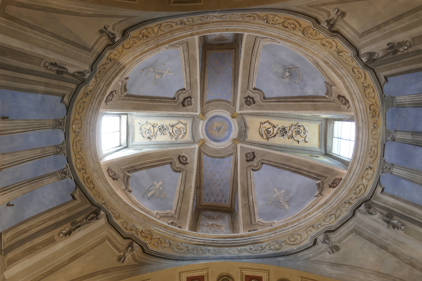 Après la première campagne de travaux de 1810, Il semble que le couvrement (le dôme) actuel est plus bas que celui d’origine. Le lanternon a été réduit au vu des peintures se retrouvant au-dessus et découverte par Mr Jean François GRANGE CHAVANIS notamment les personnages décrits dans l’essai de monographie paroissiale de Mme Jacqueline JORCIN-ROCH.