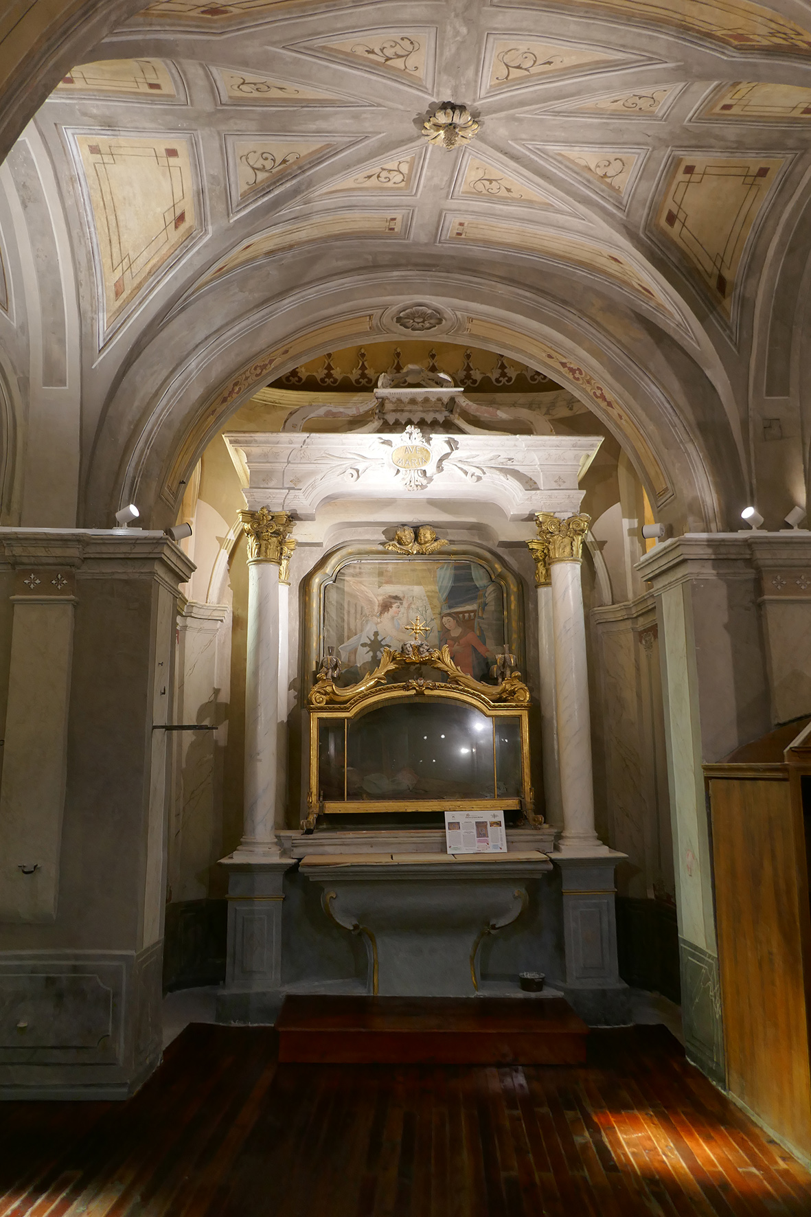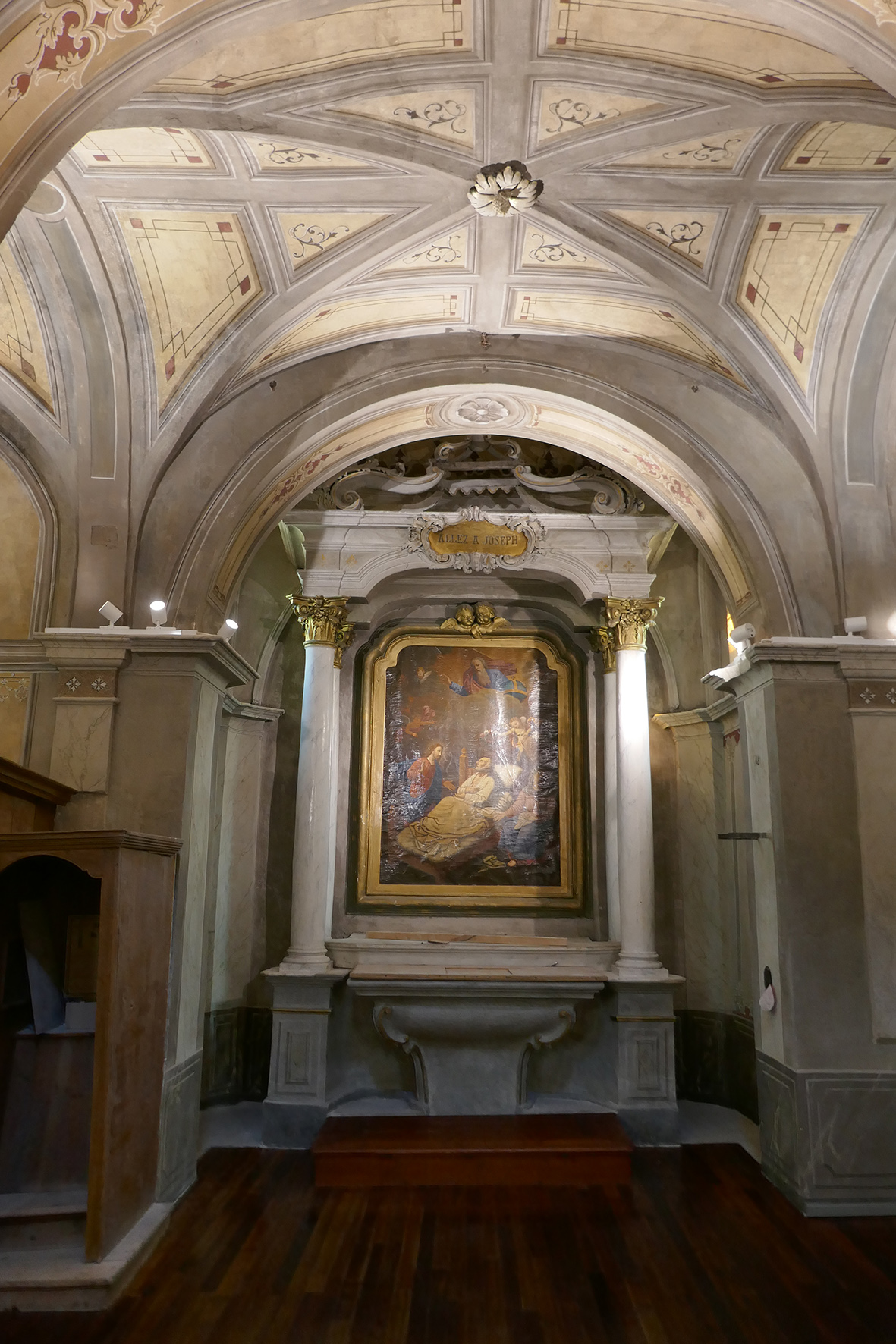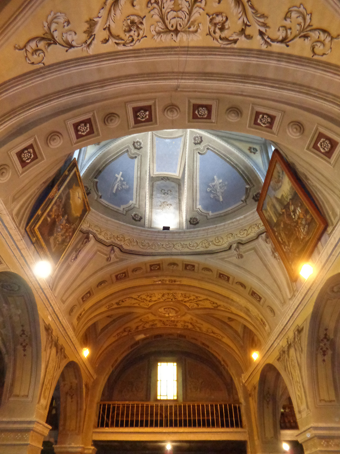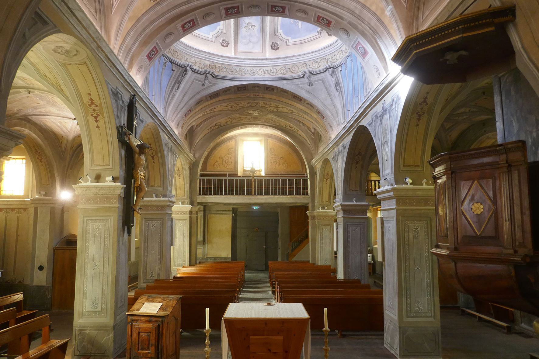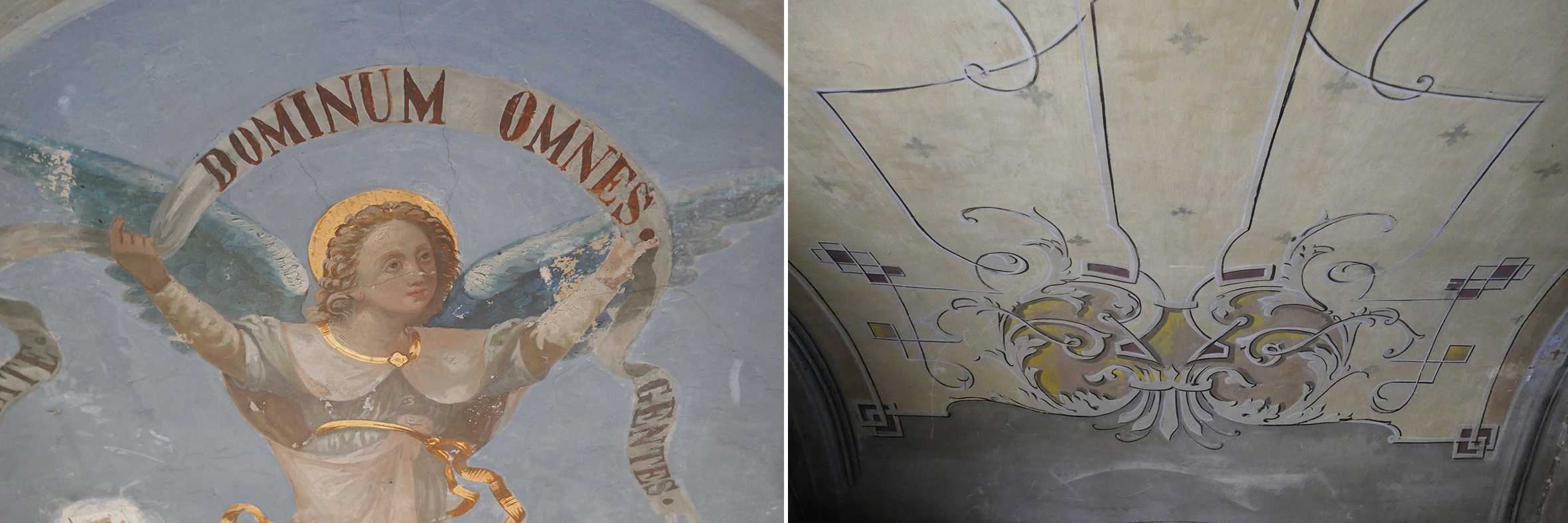 La mention “PINSEANUOVO TUTTA LA CHIESA” (“a peint toute l’église”) ne laisse peu d’ambigüité sur l’étendue du travail de l’artiste. D’autres indices vont permettre de confirmer la période de réalisation des peintures avec la présence dans les décors des armoiries de personnalités ecclésiastiques de l’époque : Auguste GRUMET, évêque de Maurienne de 1924 à 1946 (sur l’arc triomphal) et Pie XI, pape de 1922 à 1939 (sur le plafond sous la tribune).