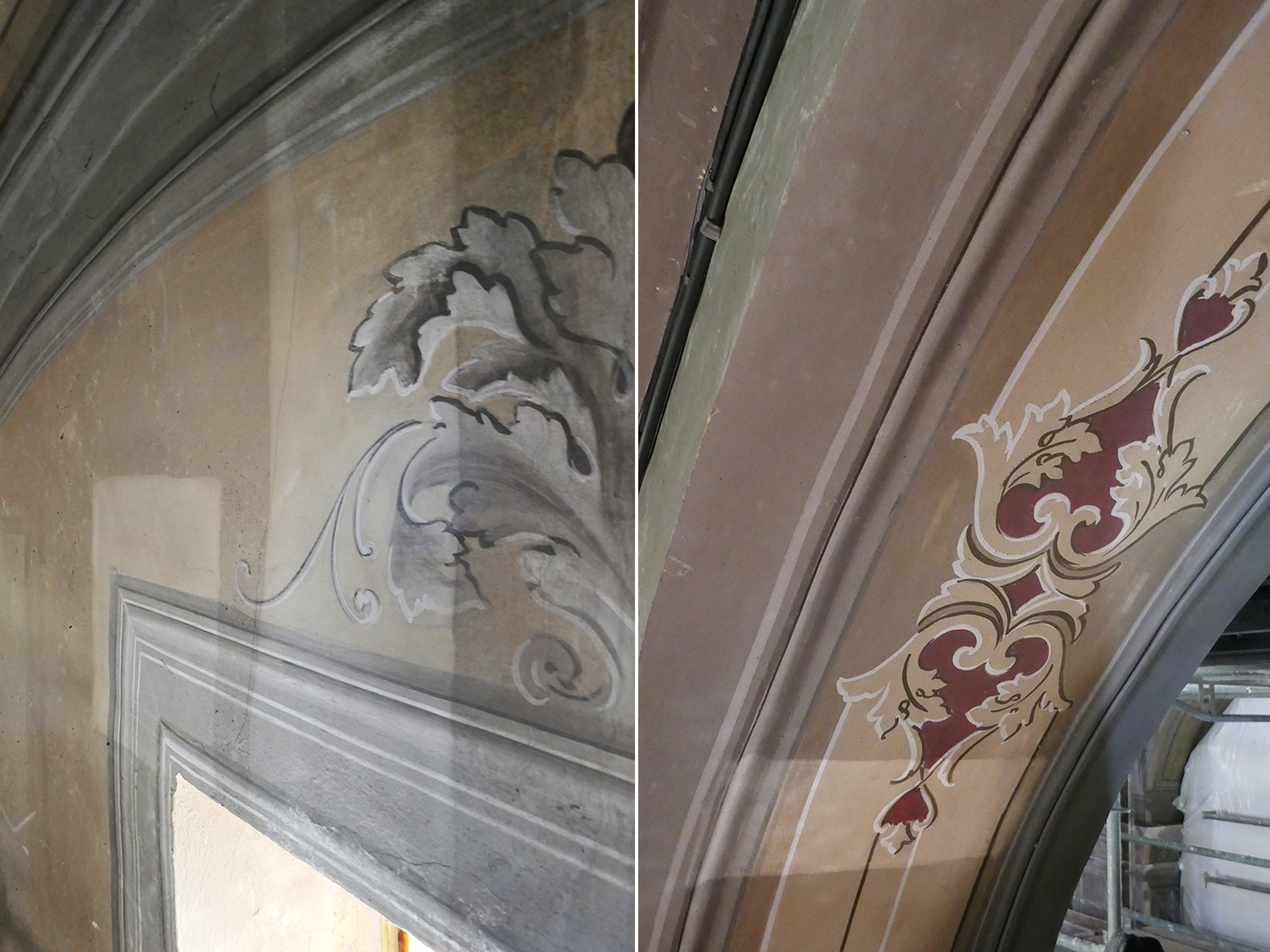 L’étude des parements des voûtes de l’église St Michel n’ont mis au jour aucun décor significatif antérieur au XIXe. Très altérés et souvent monochromes, il nous a paru inutile d’en chercher une interprétation de la composition ou une datation précise. La période XIXe est beaucoup plus riche en enseignement et la mise en parallèle avec les différents écrits retrouvés dans les archives nous permet d’en faire une chronologie plus précise.